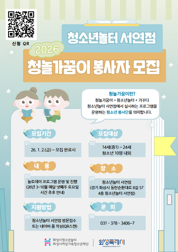 2026년 놀토데이를 함께 만들어 갈, 서연점 청놀가꿈이 청소년 자원봉사자를 모집합니다.