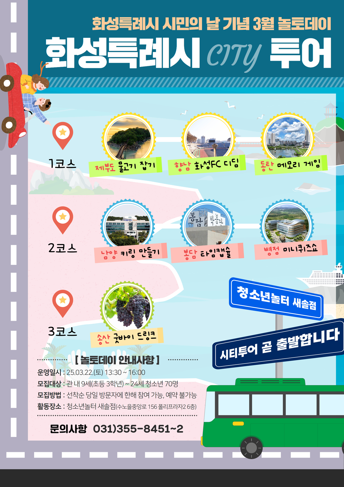 안녕하세요. 청소년놀터 새솔점입니다. 청소년놀터 새솔점 2025년 첫 놀토데이는 화성특례시 시민의 날을 맞이하여 "화성 CITY 투어"를 진행합니다. 청소년놀터 새솔점에서 화성 곳곳을 누비며 화성에 대해 알아보고 재미있고 유익한 시간을 보내봐요:D 놀토데이때 만나요~! 1) 일시 : 3.22.(토) 13:30 ~ 16:00 2) 대상 : 9세(초등 3학년)~24세 청소년 70명[선착순 모집/직접 방문] *예약 불가능 3) 장소 : 청소년놀터 새솔점(수노을중앙로 156 폴리프라자2 6층) 4) 문의사항 : 031)355-8451~2 |