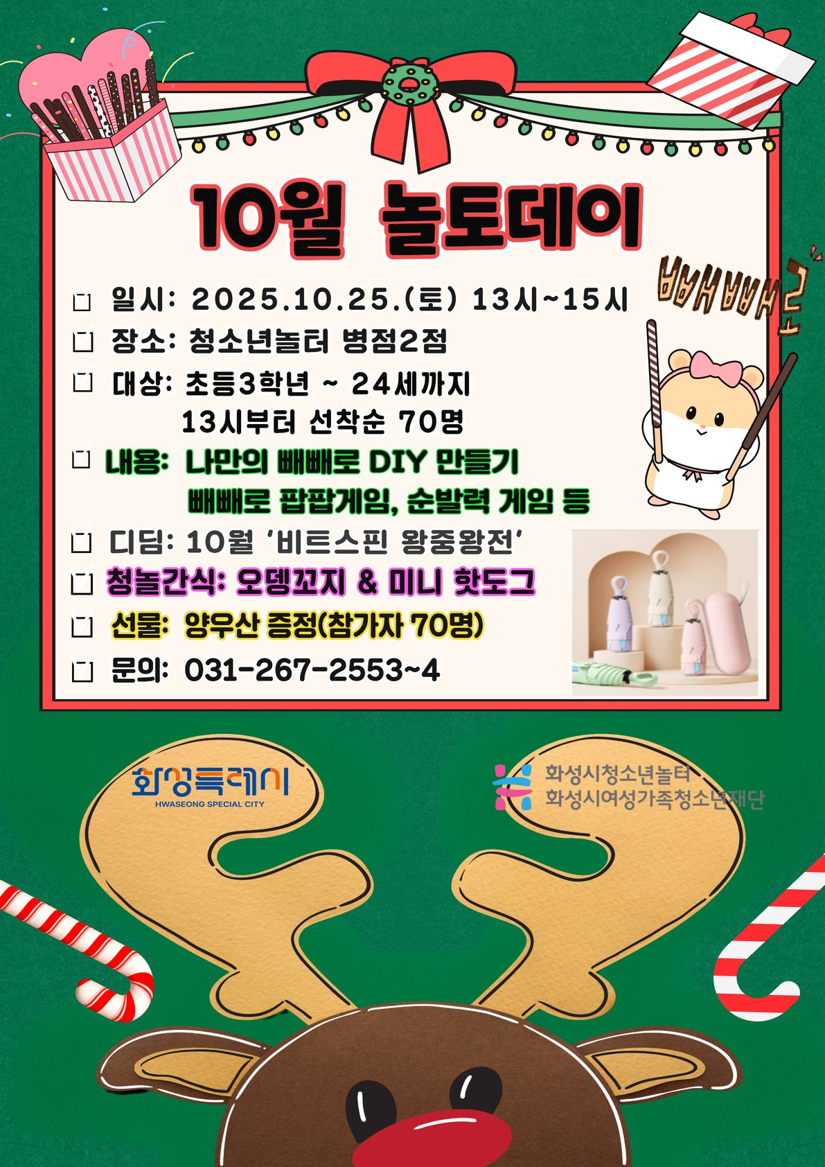 [청소년놀터 병점2점] 10월 놀토데이 '빼빼로 페스타’ 참가자 모집 재단에 바랍니다 상세 등록일 2025년 10월 11일 17시 23분 조회수 71 파일 아이콘10월 놀토데이.jpg (1.92MB)다운로드 아이콘 목록보기