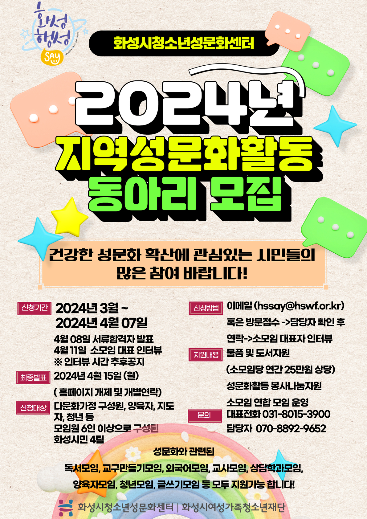 3. 신청방법 및 선정 □ 신청방법 - 제출서류 : ①신청서, ②모임회원명단(개인정보 수집·이용·제공 동의 포함) ③소모임 활동 계획서 각 1부 - 제출기간 : 2024. 3. ~ 4. 7. (일) - 제출방법 : 이메일(hssay@hswf.or.kr) □ 선정방식 : 제출서류 심사 및 대표자 인터뷰(간단한 소모임 소개)를 통해 선정 - 서류합격발표 : 2024. 4. 8.(월) - 대표자인터뷰 : 2024. 4. 11. (수) 추후공지 - 소모임 사업목적의 적합성 등을 종합적으로 고려하여 판단 □ 결과발표 : 2024. 4. 15. (월) 화성시청소년성문화센터 홈페이지 공지사항 게시 및 개별통보
