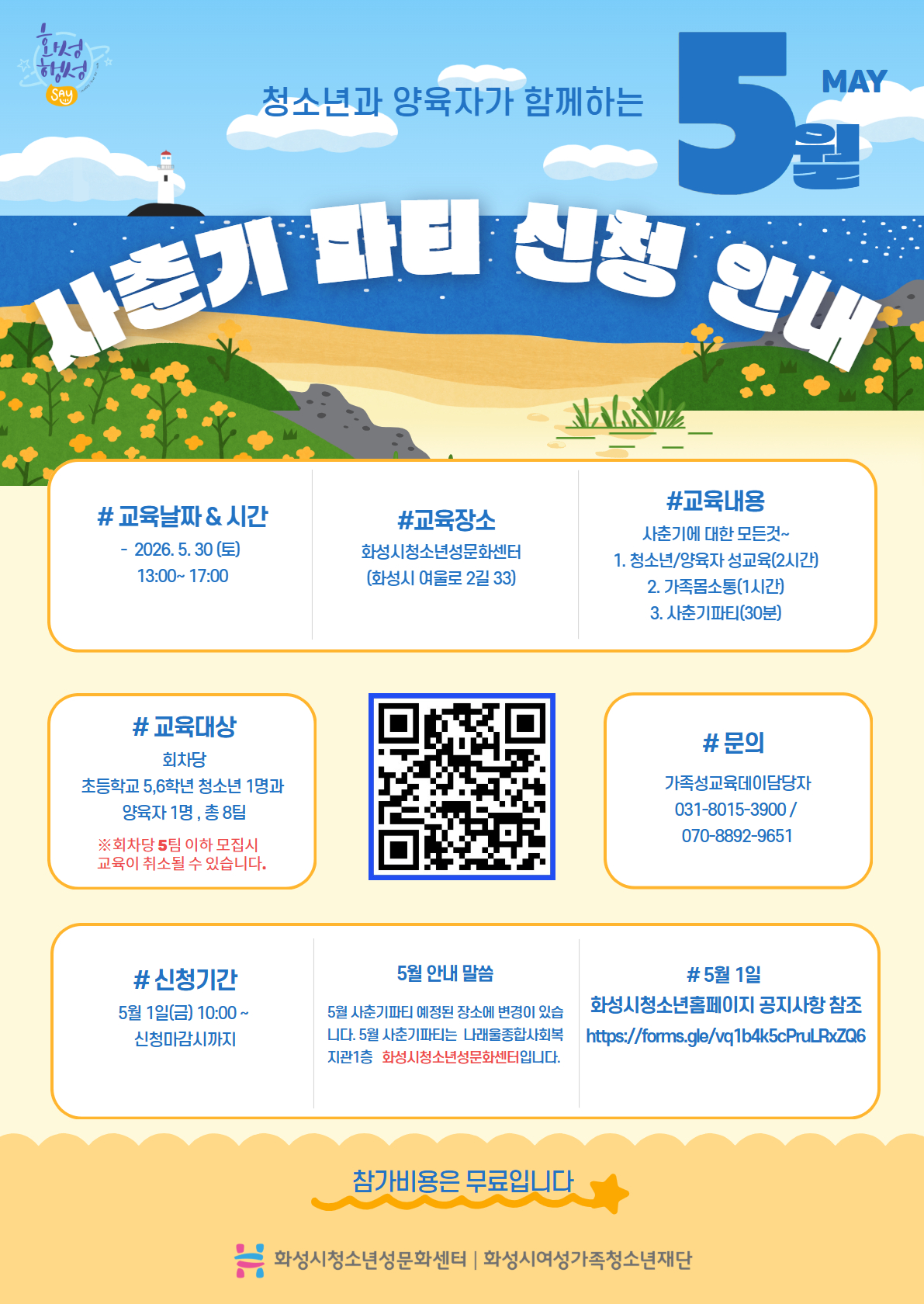 안녕하세요 화성시청소년성문화센터 사춘기파티 담당자입니다. 5월 향남으로 찾아가 프로그램을 진행하려 했으나 향남지역의 기관들이 행사로 인해 대관이 어렵다는 답변을 받아 불가피하게 화성시청소년성문화센터에서 진행 할 예정입니다. 장소를 확인하시고 프로그램을 신청해주시면 감사하겠습니다. 5월은 5월 1일부터 접수를 받고,6월부터 매월 첫 주 월요일 10시부터 접수를 받도록 하겠습니다. 많은 신청 부탁드립니다. 장소 변경에 다시 한번 양해 말씀드립니다. 2026년 화성시청소년성문화센터에서 사춘기파티를 준비했습니다. 사춘기를 맞이하는 청소년과 양육자가 함께하는 소통하고 축하하는 가족친화 체험형 성교육입니다. 1. 교육날짜 : 2026년 5월 30일 토요일 13시~17시 2. 교육장소 : 나래울종합사회복지관 1층 화성시청소년성문화센터와 지정장소 3. 참여대상: 청소년1명 (초등5~6학년)과 양육자 1명 총 8팀 4. 주요내용: 청소년성교육, 양육자성교육, 가족몸소통, 사춘기파티 5. 참가비용: 없음 6. 신청방법: 구글폼 신청 후 담당자 확정 연락예정 https://forms.gle/vq1b4k5cPruLRxZQ6 7. 문의: 화성시청소년성문화센터 가족성교육데이 담당자 031-8015-3900/070-8892-9651