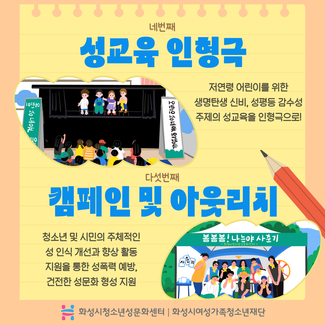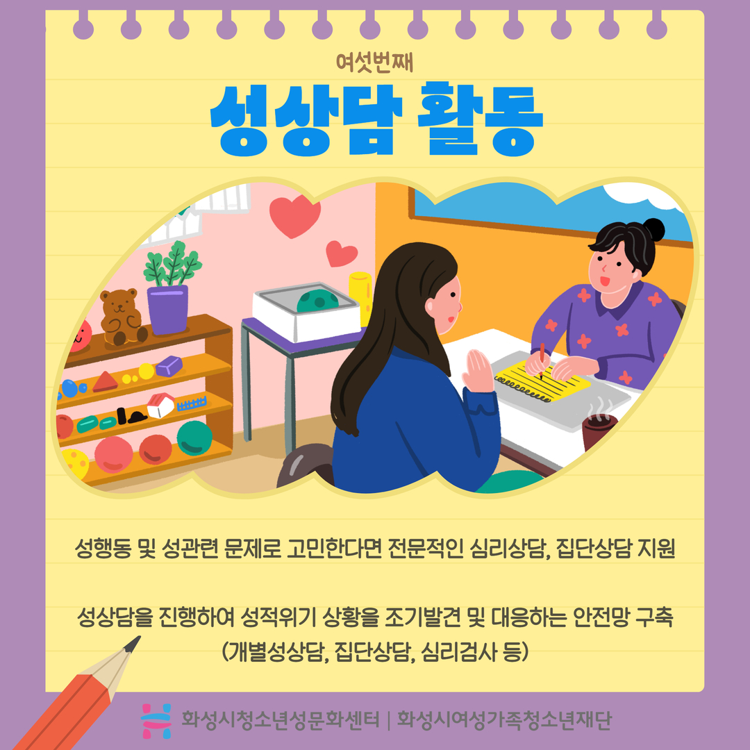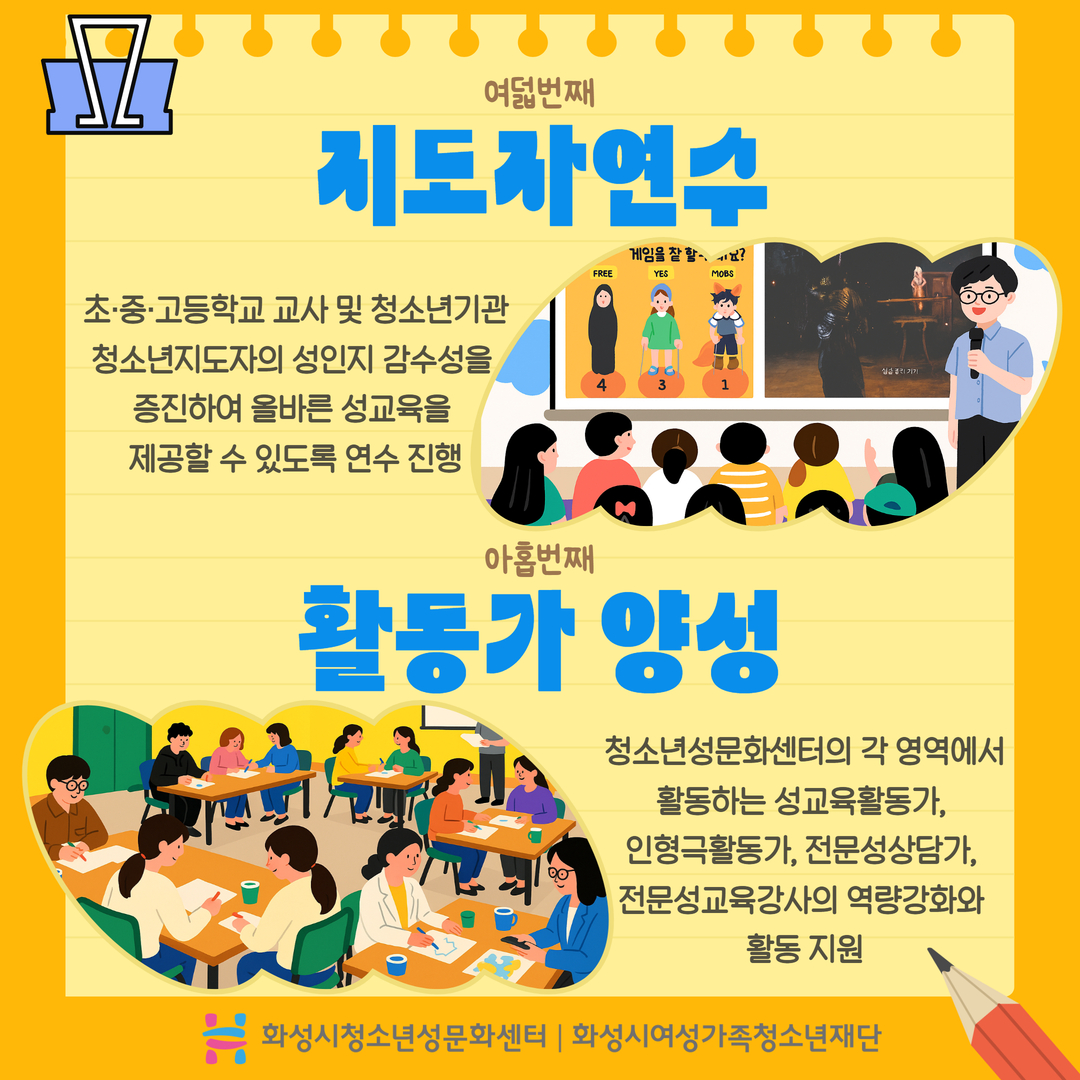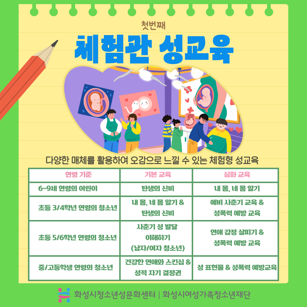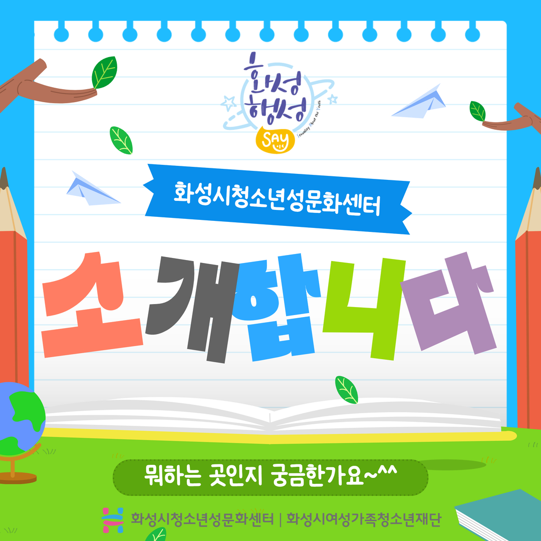 화성시청소년성문화센터를 소개합니다. 화성시청소년성문화센터는 아동/청소년에서 성인에 이르기까지 성을 배우고, 행복한 '성'을 꿈꾸는 곳!! 건강한 성가치관을 지닌 개인으로 성장 할 수 있도록 마련된 성문화 놀이터로 청소년에게 필요한 성교육 및 올바른 성가치관 형성을 위한 교육기관 입니다.