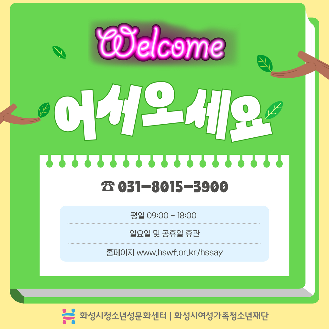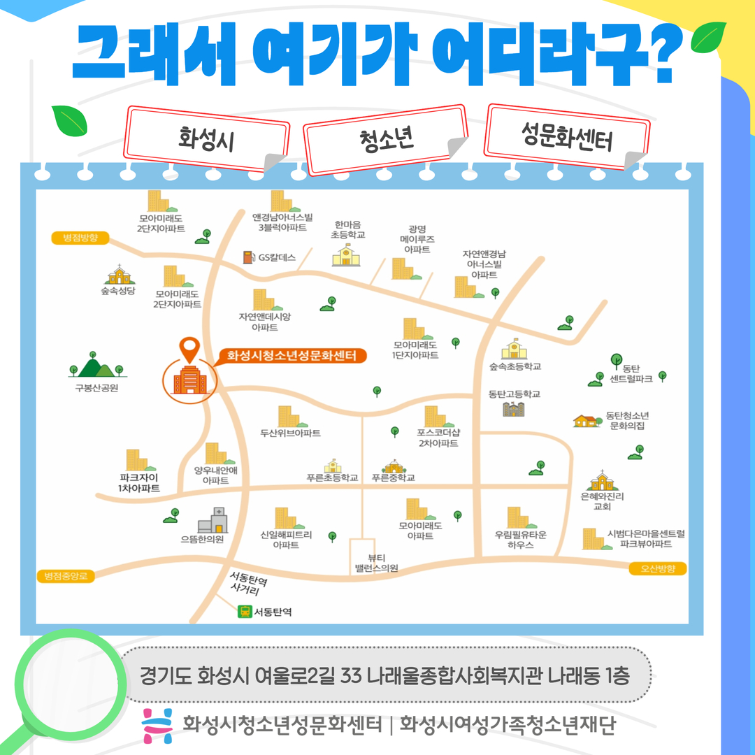 그래서 여기는 화성시청소년성문화센터는 경기도 화성시 여울로2길 33 나래울종합사회복지관 나래동 1층에 위치해 있습니다. 기타 문의 사항은 031-8015-3900로 전화 주세요^^