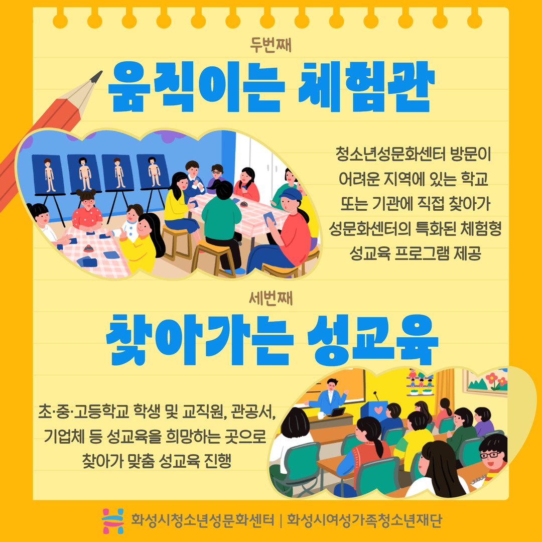 [첫번째 체험관 성교육] 다양한 매체를 활용하여 오감으로 느낄 수 있는 체험형 성교육 [두번째 움직이는 체험관] 청소년성문화센터 방문이 어려운 지역에 있는 학교 또는 기관에 직접 찾아가 성문화센터의 특화된 체험형 성교육 프로그램 제공 [세번째 찾아가는 성교육] 초/중/고등학교 학생 및 교직원, 관공서, 기업체 등 성교육을 희망하는 곳으로 찾아가 맞춤 성교육 진행 [네번째 성교육 인형극] 저연령 어린이를 위한 생명탄생 신비, 성평등 감수성 주제의 성교육을 인형극으로 진행 [다섯번째 캠페인 및 아웃리치] 청소년 및 시민의 주체적인 성 인식 개선과 향상 활동 지원을 통한 성폭력 예방, 건전한 성문화 형성 지원 [여섯번째 성상담 활동] 성행동 및 성관련 문제로 고민한다면 전문적인 심리상담, 집단상담 지원하여 성상담을 진행하여 성적위기 상황을 조기발견 및 대응하는 안전망 구축 [일곱번째 사춘기 파티] 사춘기를 맞이하는 어린이와 양육자가 함께 참여하는 성교육, 가족스킨십 소통 프로그램 [여덟번째 지도자 연수] 초/중/고등학교 교사 및 청소년기관 청소년지도자의 성인지 감수성을 증진하여 올바른 성교육을 제공할 수 있도록 연수 진행 [아홉번째 활동가 양성] 청소년성문화센터의 각 영역에서 활동하는 성교육활동가, 인형극활동가, 전문성상담가, 전문성교육강사의 역량강화와 활동지원