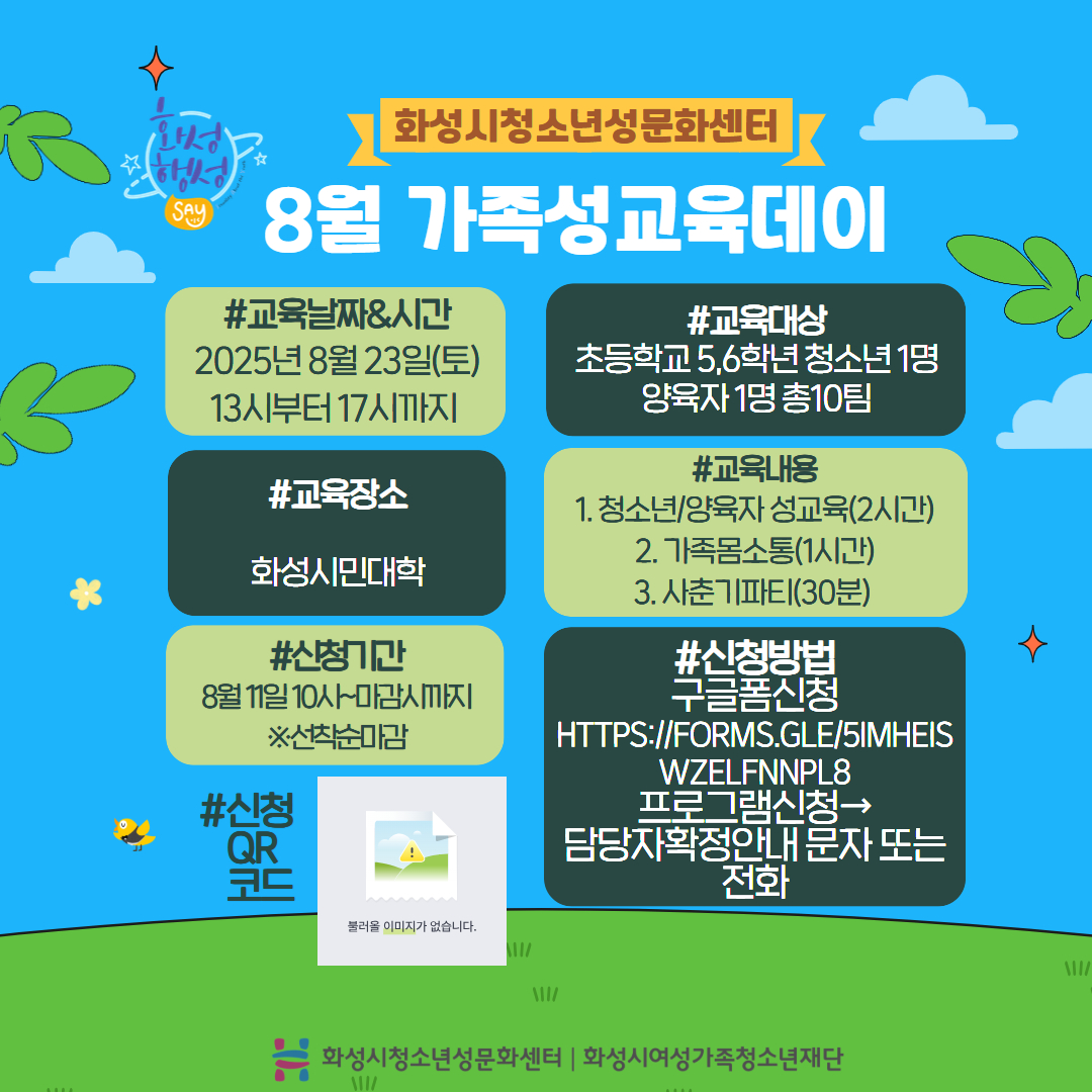 제목 [청소년성문화센터] 8월 가족성교육데이 신청안내(장소: 화성시민대학)