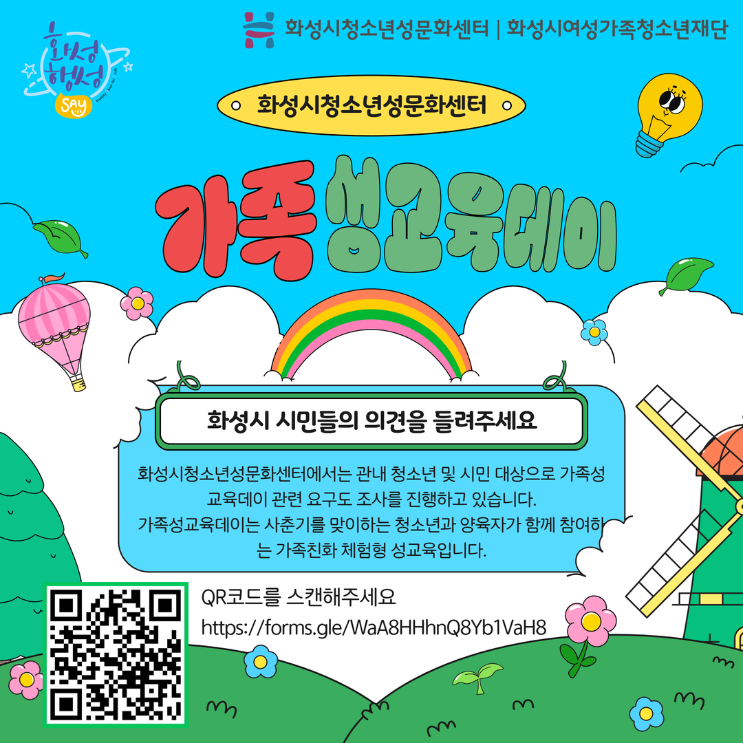 화성시청소년성문화센터에서 운영되는 가족성교육데이 관련하여 화성시 시민들의 이야기를 듣고 반영하여 더 나은 프로그램으로 발전하고자 요구도 조사를 진행하고 있습니다.