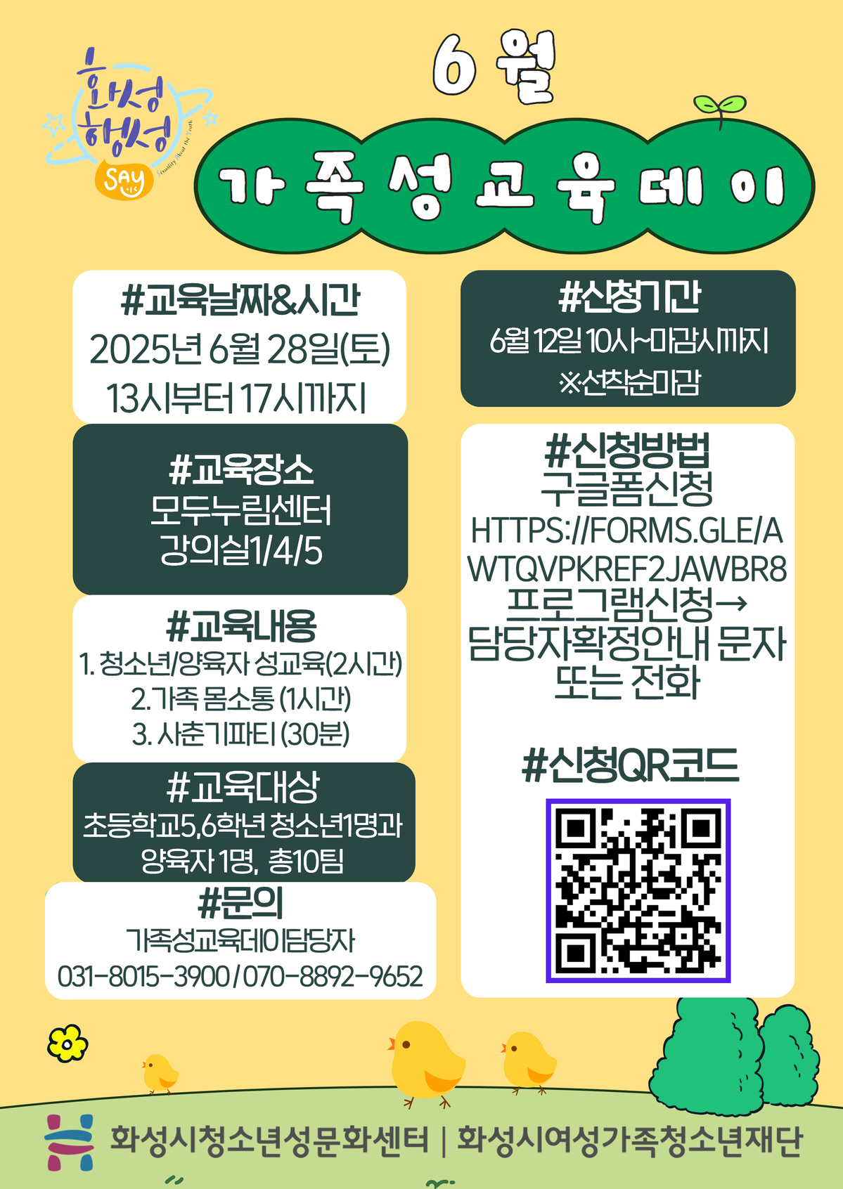 첨부 파일 아이콘2025년 화성시청소년성문화센터 6월 가족성교육데이 안내문.jpg (965.08KB)다운로드 아이콘 파일 아이콘6월 가족성교육데이 큐알코드.jpg (28.34KB)다운로드 아이콘