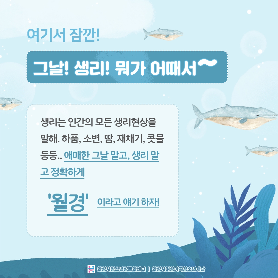 여기서 잠깐! 그날! 생리! 뭐가 어때서~ 생리는 인간의 모든 생리현상을 말해. 하품, 소변, 땀, 재채기, 콧물 등등.. 애매한 그날 말고, 생리 말고 정확하게 '월경' 이라고 얘기 하자!