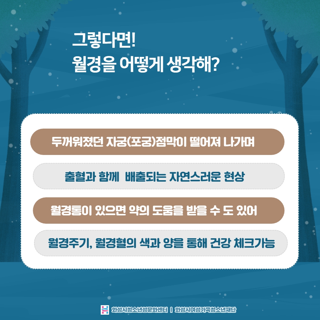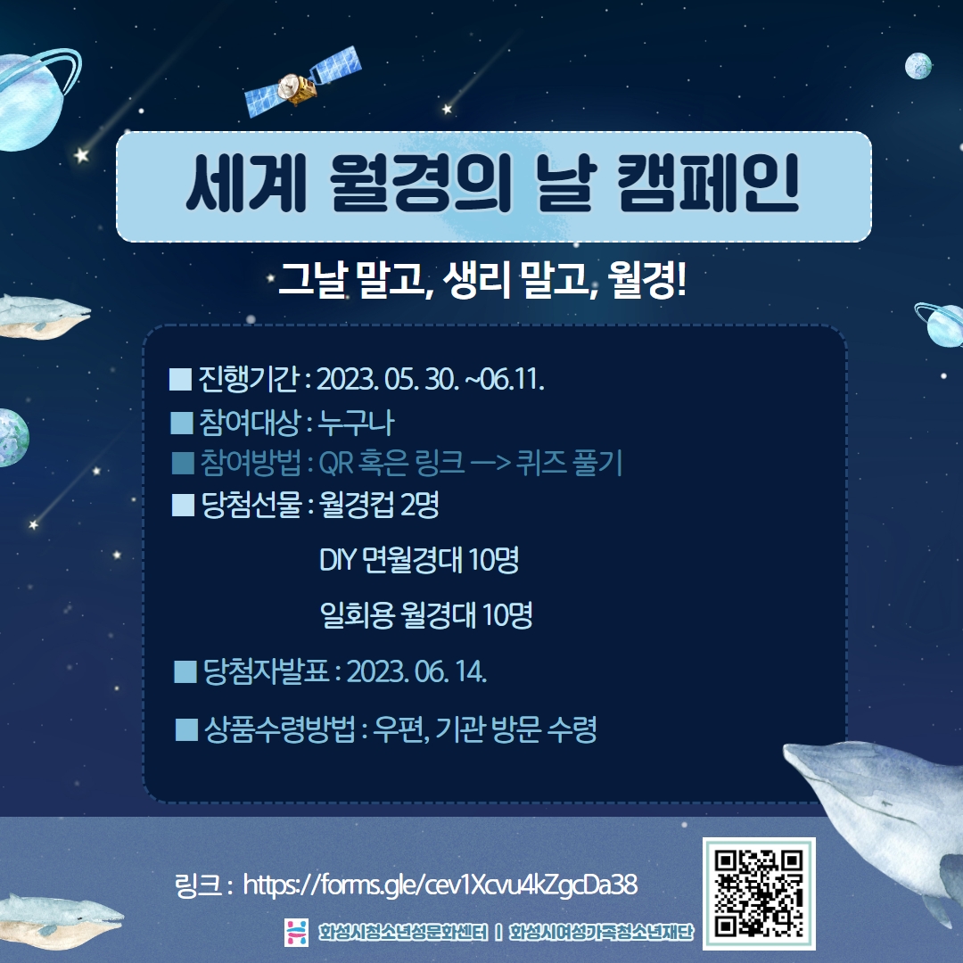 5월 28일 <세계 월경의 날>을 기념하여 화성시청소년성문화센터가 "그날 말고, 생리 말고, 월경!" 캠페인을 진행합니다. 월경에대한 이해와 월경용품에대한 정보를 퀴즈를 통해 알아보고 추첨을 통해 상품을 증정합니다. 많은 참여 부탁드립니다.