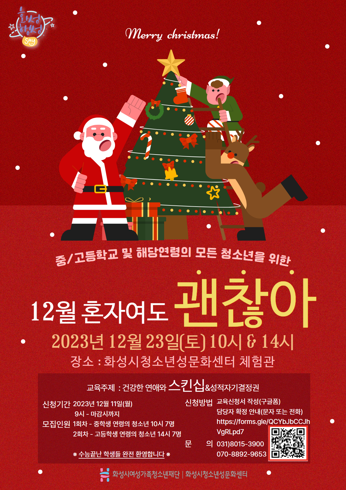 1. 일자: 2023년 12월. 23.(토) 10시 & 14시 2. 교육시간: 1시간 3. 대상: 1회차 - 중학교 1,2,3학년 및 해당 연령의 모든 청소년 7명 2회차 - 고등학교 1,2,3학년 및 해당 연령의 모든 청소년 7명 ※ 회차 상황에 따라 모집 인원은 달라질 수 있음 4. 교육주제: 건강한 연애와 스킨십 & 성적자기결정권 5. 신청기간: 12월 11일(월) 09시 ~ 마감 시까지 6. 신청방법: 교육신청서 작성(구글폼 : https://forms.gle/ympRtkhHErf5ueTz7 ) → 담당자 확정 안내(문자 또는 전화) ※ 총 신청자가 5명 미만일 경우 교육 취소될 수 있음 7. 장소: 화성시청소년성문화센터 체험관 8. 비용: 무료 9. 문의: '혼자여도 괜찮아' 사업 담당자 (031-8015-3900 / 070-8892-9653) |