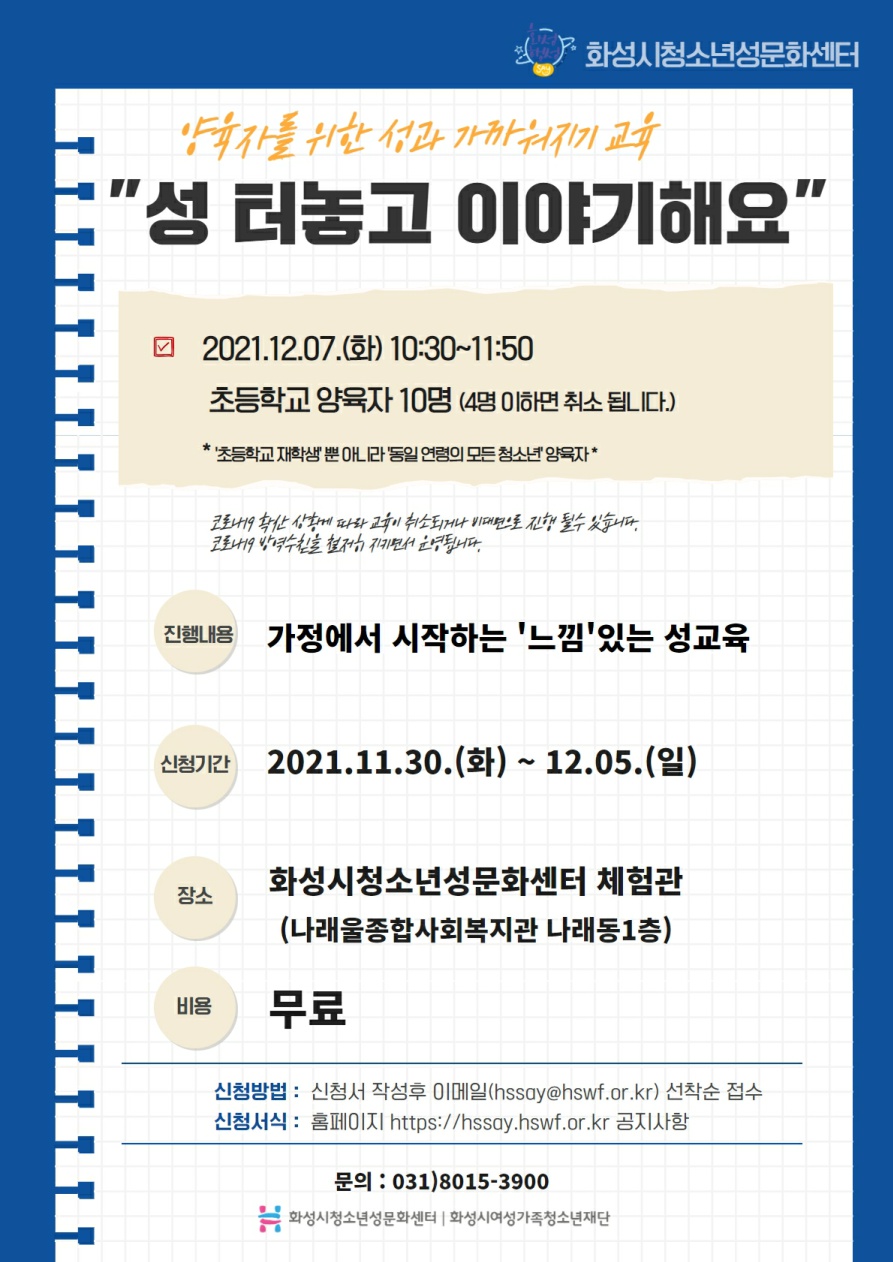 | 제목 | [화성시청소년성문화센터] "성터놓고 이야기해요" - 2021년 12월 07일(화요일) 참가자 모집 | ||