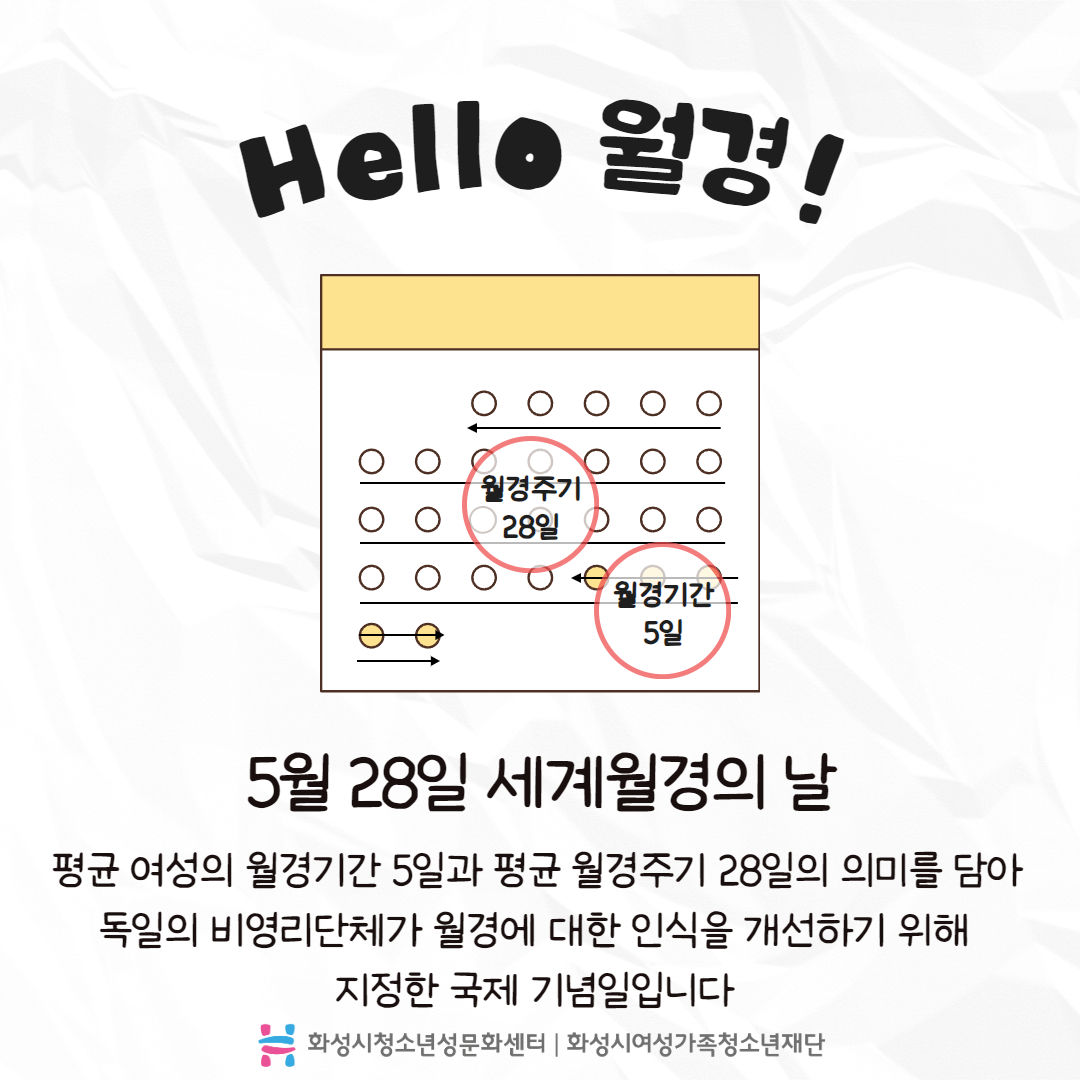 #2 HELLO 월경! 5월 28일 세계월경의 날 평균 여성의 월경기간 5일과 평균 월경주기 28일의 의미를 담아 독일의 비영리단체가 월경에 대한 인식을 개선하기 위해 지정한 국제 기념일입니다