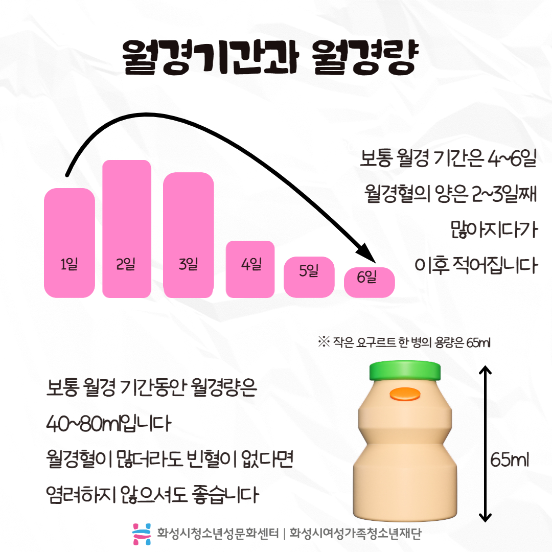 #4 월경기간과 월경량 보통 월경 기간은 4~6일 월경혈의 양은 2~3일째 많아지다가 이후 적어집니다 보통 월경 기간동안 월경량은 40~80ml입니다 월경혈이 많더라도 빈혈이 없다면 염려하지 않으셔도 좋습니다