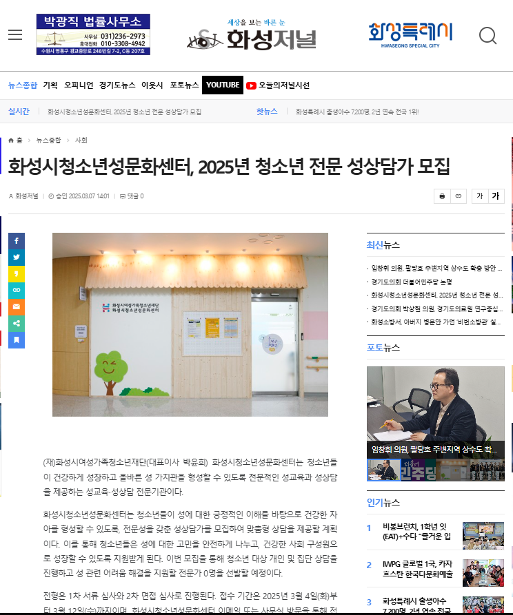 화성시청소년성문화센터, 2025년 청소년 전문 성상담가 모집 재단에 바랍니다 상세 운영센터 화성시청소년성문화센터 등록일 2025년 3월 7일 17시 28분 조회수 217 https://www.hsj.co.kr/news/articleView.html?idxno=36580 파일 아이콘2025. 3. 7. 전문성상담가 모집안내-1.png (377.91KB)다운로드 아이콘 목록보기