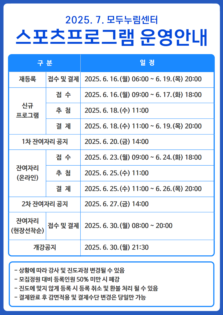 | 제목 | [모두누림센터] 2025년 7월 스포츠프로그램 운영 안내 | ||