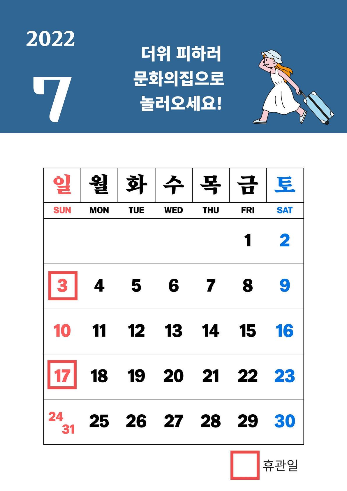 제목 [누림청소년문화의집] 7월 청소년자율이용공간 이용 안내 운영센터 모두누림센터 작성일 2022년 6월 28일 15시 25분 조회수 1,083 안녕하세요 누림청소년문화의집 입니다. 아래 7월 일정을 안내드리오니 확인하시고 방문해주시기 바랍니다. 목록보기