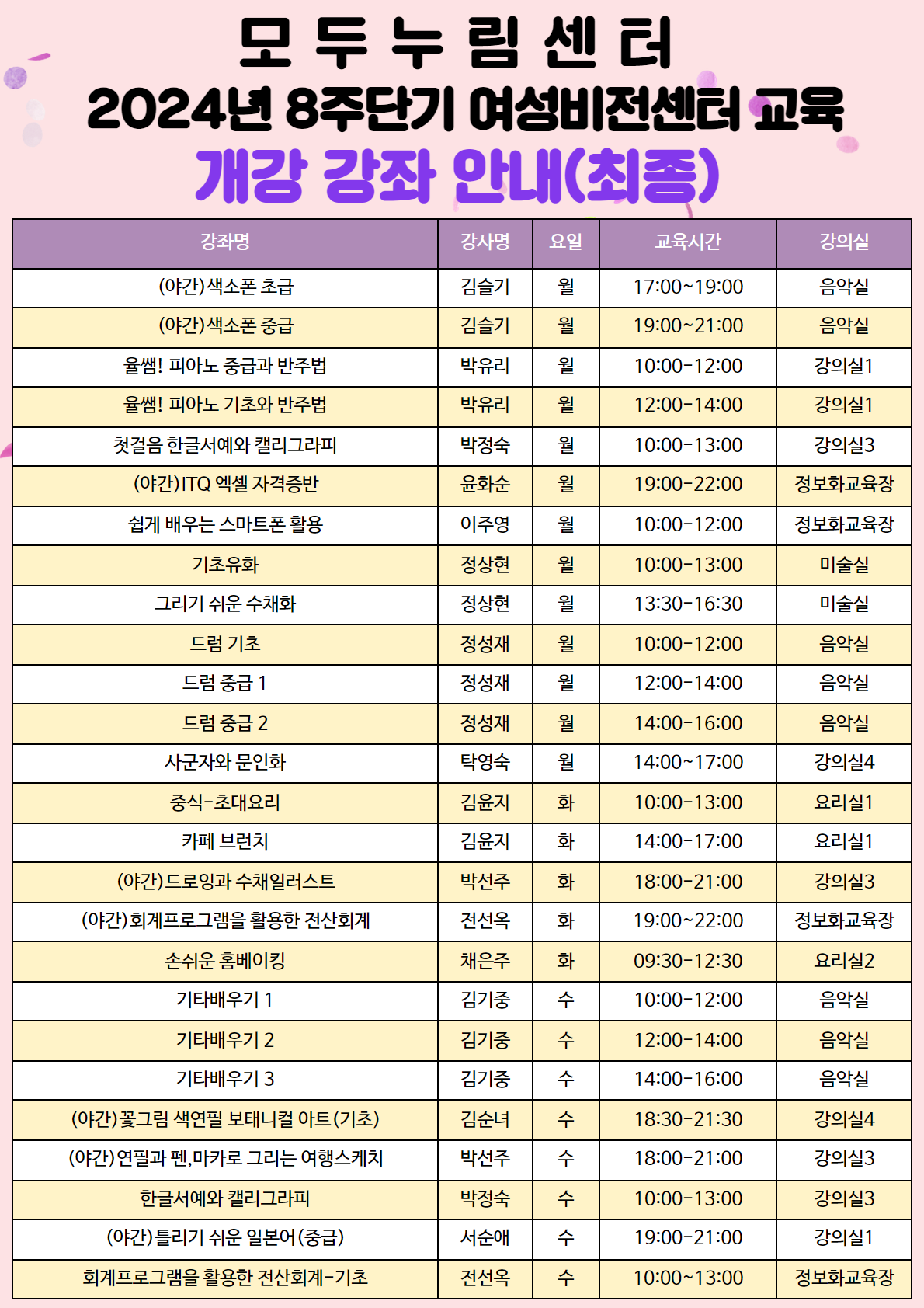 [화성시여성비전센터] 2024년 8주단기 모두누림센터 교육프로그램 개폐강 안내