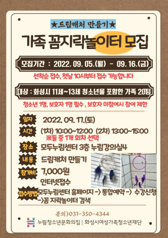 안녕하세요. 누림청소년문화의집 입니다. 9월 꼼지락놀이터_드림캐처 만들기 프로그램 진행합니다.