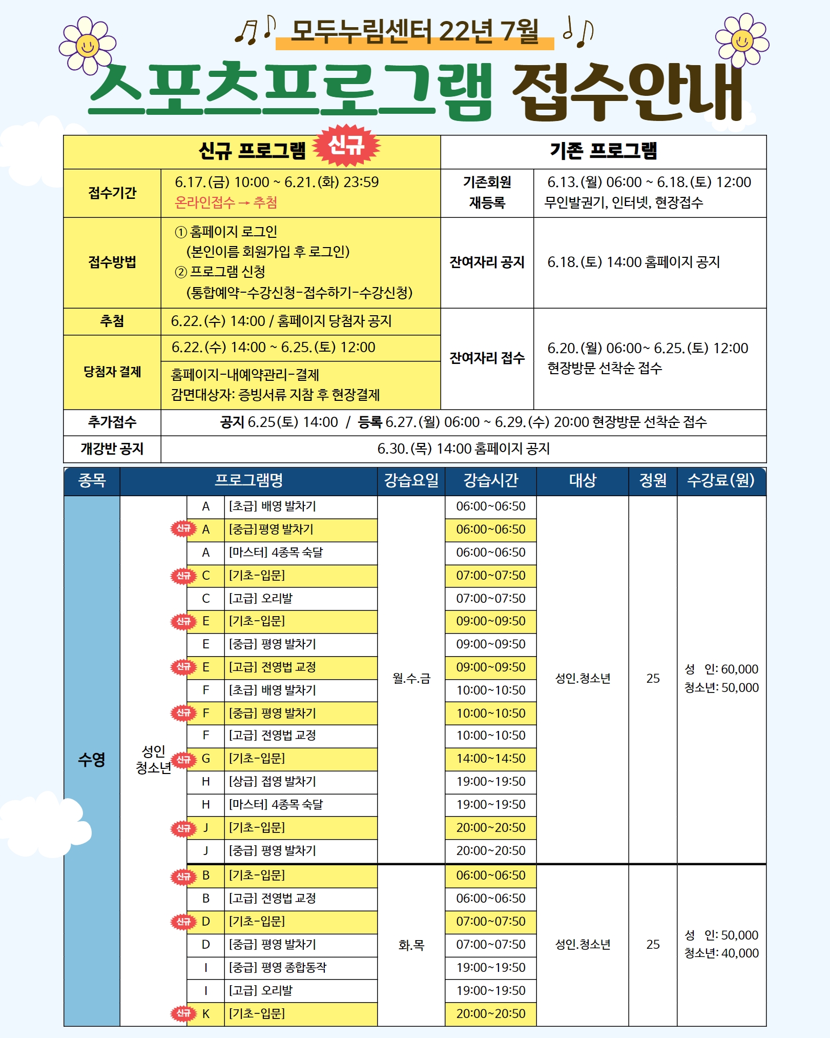 [모두누림센터] 7월 스포츠프로그램 접수안내(신규반, 기존반)