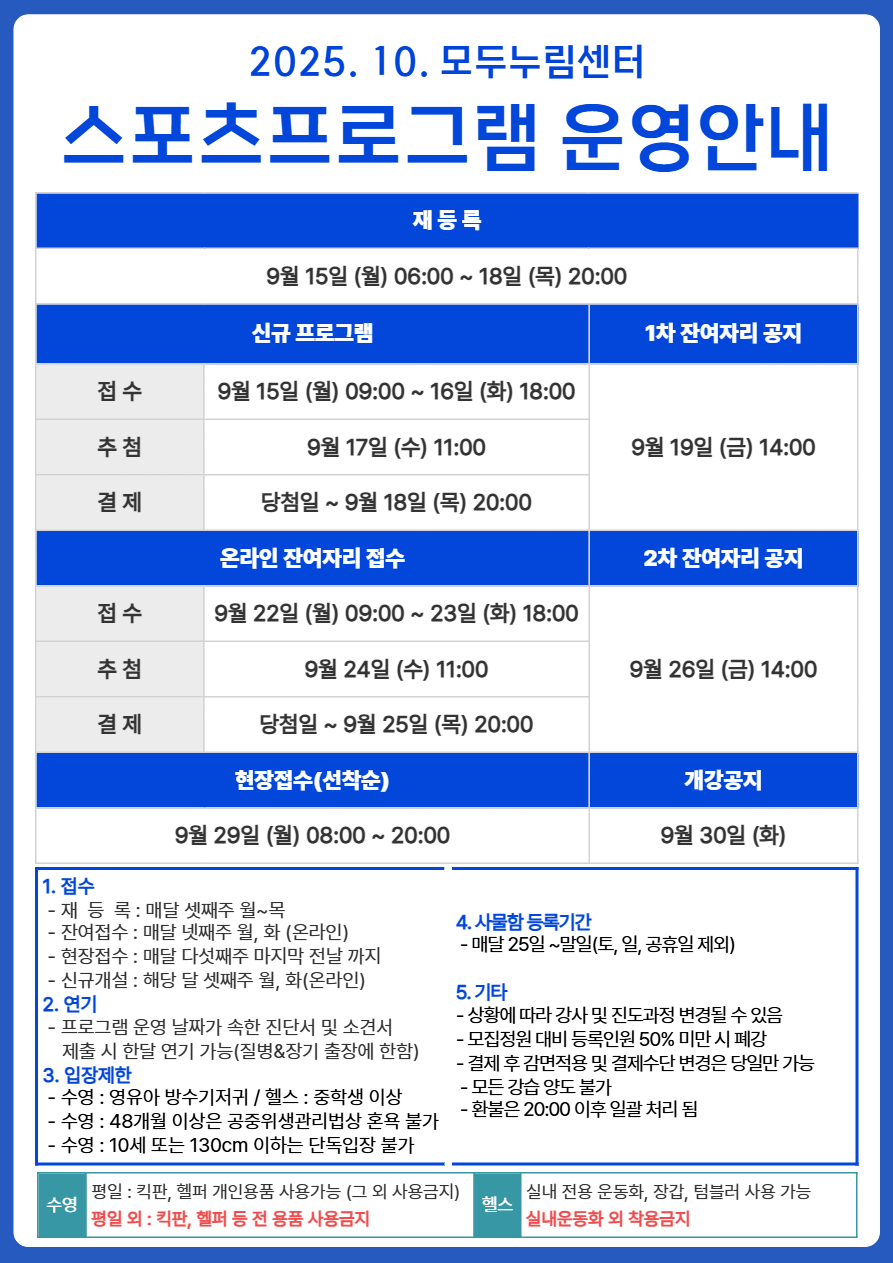 | 제목 | [모두누림센터] 2025년 10월 스포츠프로그램 운영 안내 | ||