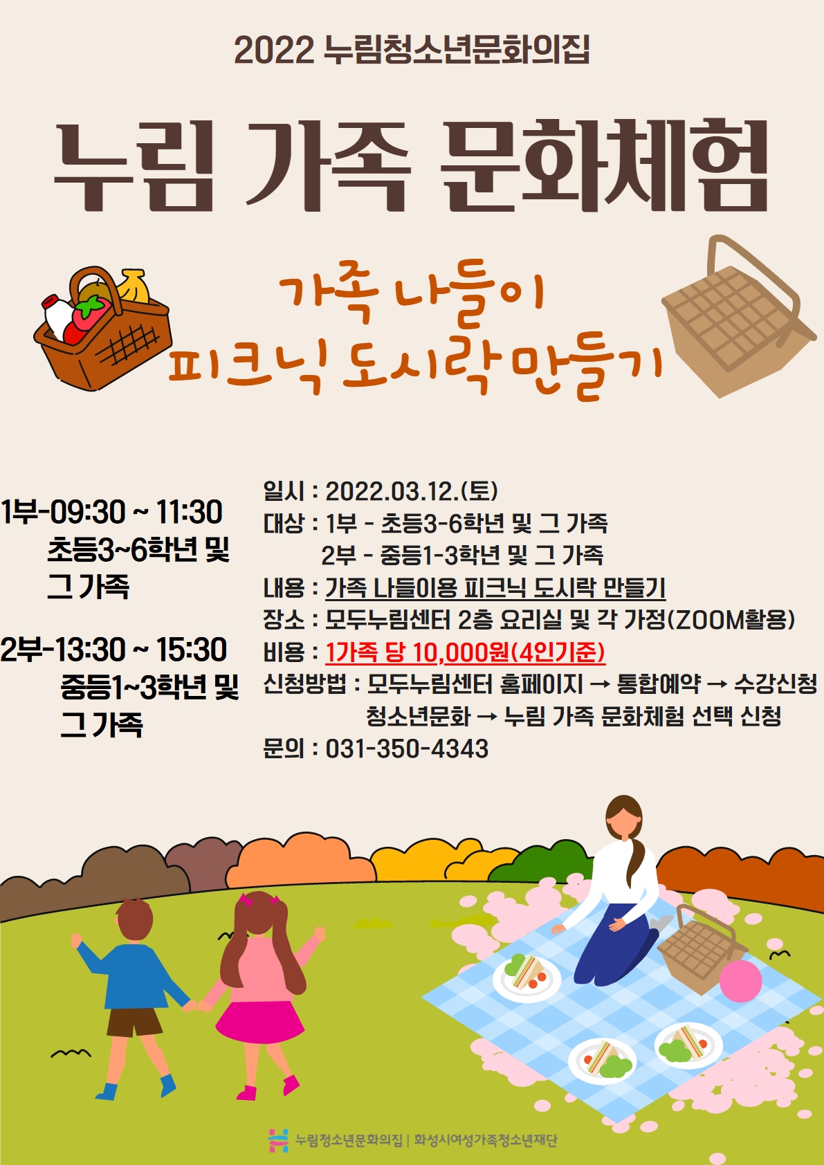제목 [누림청소년문화의집] 누림 가족 문화체험 1차 '가족 나들이 피크닉 도시락 만들기!'(비대면) 참가자 모집