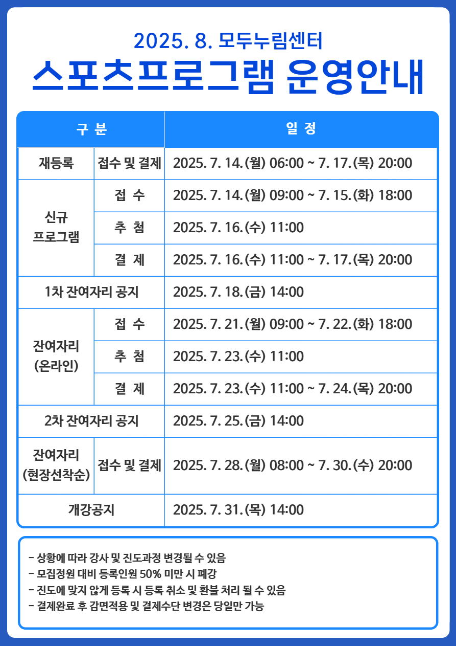 | 제목 | [모두누림센터] 2025년 8월 스포츠프로그램 운영 안내 | ||