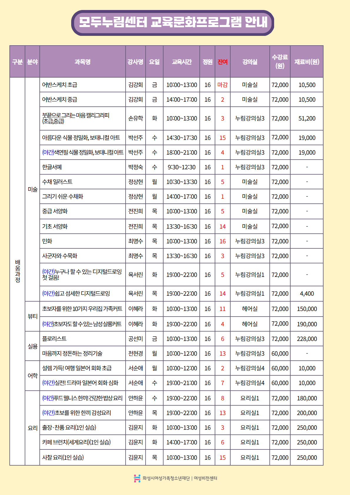 | 제목 | [화성시여성비전센터]2026년 2학기 모두누림센터{남양} 교육 프로그램 2차 잔여자리 공지(2026. 4. 16. 20:00시 기준) | ||