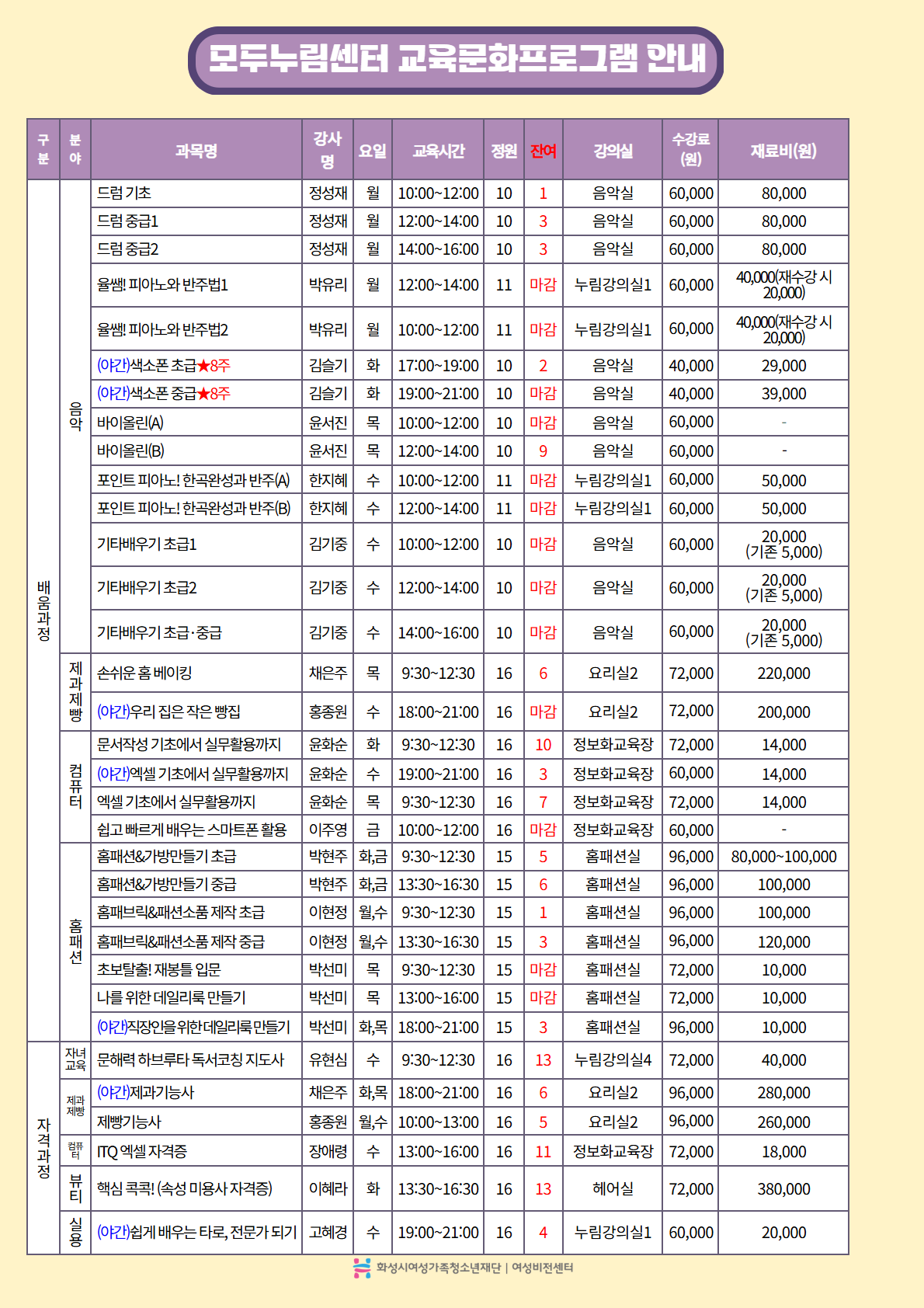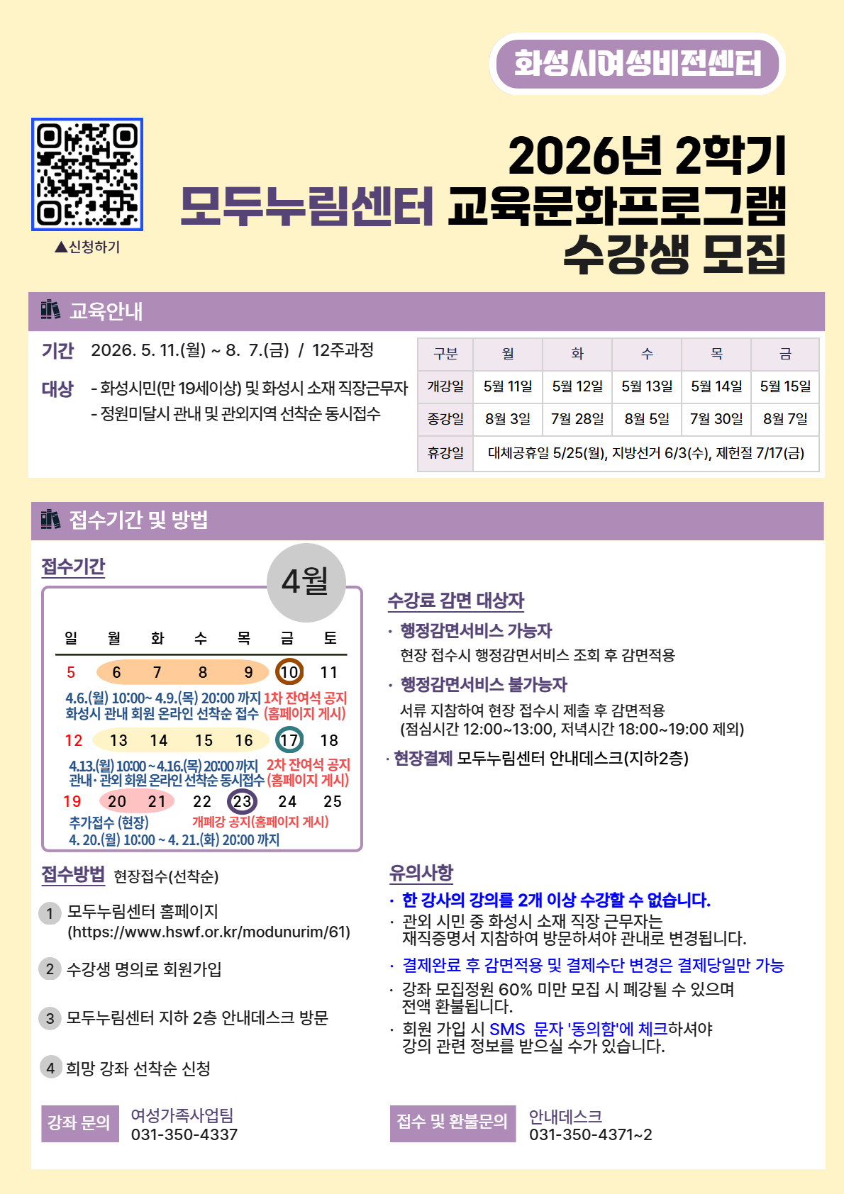 □ 교육기간: 2026. 5. 11.(월) ~ 8. 7.(금) [12주 과정] ※ 5. 25.(월) 대체공휴일, 6. 3.(수) 지방선거, 7. 17.(금) 제헌절 휴무 ※ 12회 수업을 보장해 드리며, 화성시주최행사 및 재단 사정에 의해 교육일정 변경이 있을 수 있습니다. □ 교육대상: 화성시민 및 화성시 소재 직장 근무자(정원 미달 시, 기타지역 접수) □ 접수방법 ☞ 1차 온라인 선착순 접수(관내 우선), 2차 온라인 선착순 접수(관내 및 관외), 3차 현장접수(관내 및 관외) ※ 사전에 회원가입 부탁드립니다. ※ 김슬기 강사님의 개인 사정으로 (야간) 색소폰 초급, (야간) 색소폰 중급 강좌는 8주 과정으로 운영되며, 6월 9일 화요일에 개강합니다. ※ 윤화순 강사님의 개인 사정으로 (야간) 엑셀 기초부터 실무활용까지, (주간) 엑셀 기초부터 실무활용까지 강좌의 1주차 수업은 대체 강사로 진행될 예정입니다. ※문의) 031-350-4337(모두누림센터) |