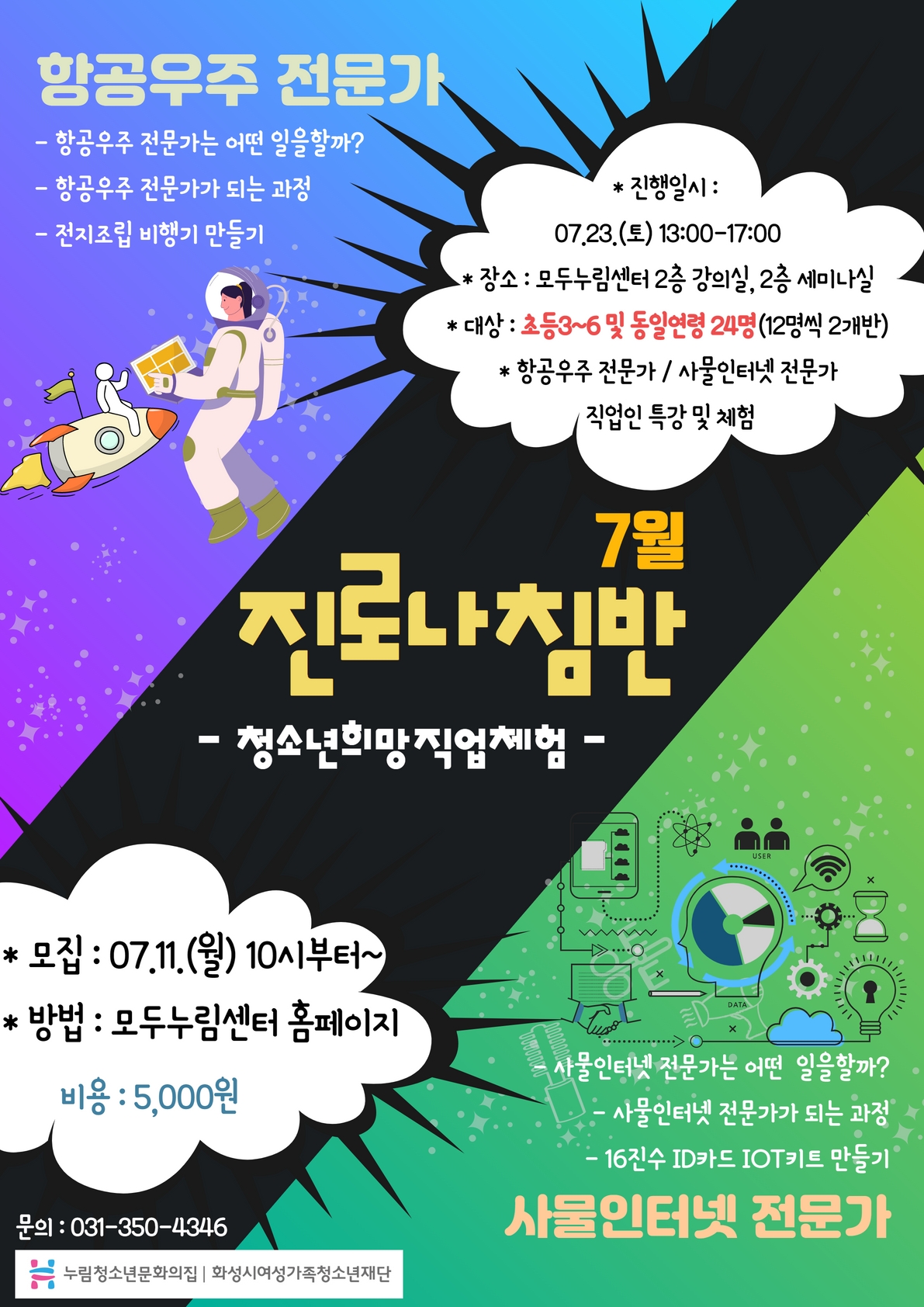 | 제목 | [누림청소년문화의집] 진로나침반 5탄 <항공우주 전문가 / 사물인터넷 전문가> 참가자 모집 | ||