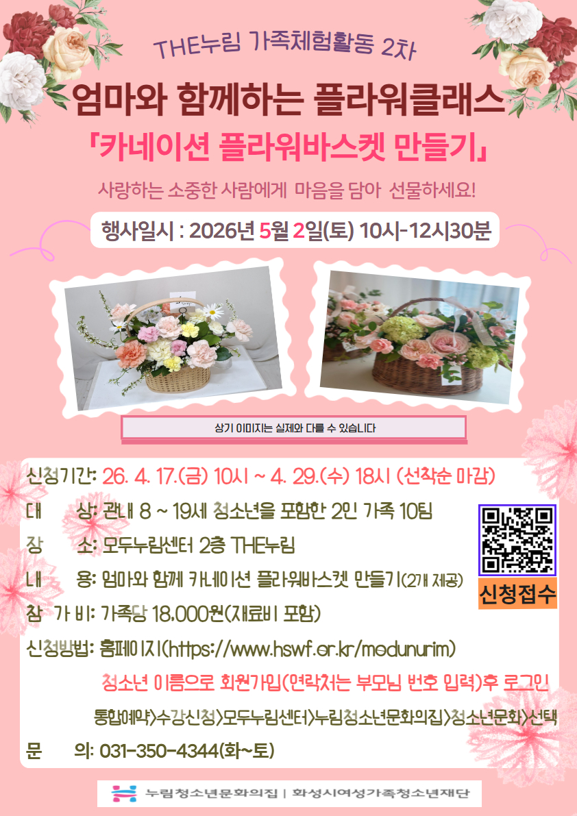 안녕하세요! 누림청소년문화의집입니다^^ 초등~고등 청소년 가족이 함께하는 THE누림 가족체험활동 2차 운영합니다. 어버이날 기획 프로그램으로 “엄마와 함께 카네이션 플라워바스켓 만들기”(가족당 2개 제공)를 진행합니다. 자녀가 카네이션 코사지를 만들어서 어머님 가슴에 달아드리는 시간이 마련되어 있으며 카네이션 플라워바스켓을 만들고 부모님께 감사편지도 써보는 소중한 시간도 준비되어 있으니 많은 관심과 참여 부탁드립니다^^ ※ 모집내용 및 신청방법 행사일시: 2026. 5. 2.(토) 10:00 ~ 12:30 신청기간: 2026. 4. 17.(금) 10:00 ~ 4. 29.(수) 18:00까지 (선착순마감) 신청방법: 모두누림센터 홈페이지 청소년 이름으로 회원가입(연락처는 부모님 번호 입력)후 로그인 통합예약>수강신청>모두누림센터>누림청소년문화의집>청소년문화>선택 참 가 비: 가족당 18,000원(1가족 2인 기준 재료비포함) 대 상: 관내 8-19세 청소년을 포함한 2인 가족 10팀 장 소: 모두누림센터 2층 THE누림 내 용: 엄마와 함께 카네이션 플라워바스켓 만들기 문 의: 031-350-4344(화-토)