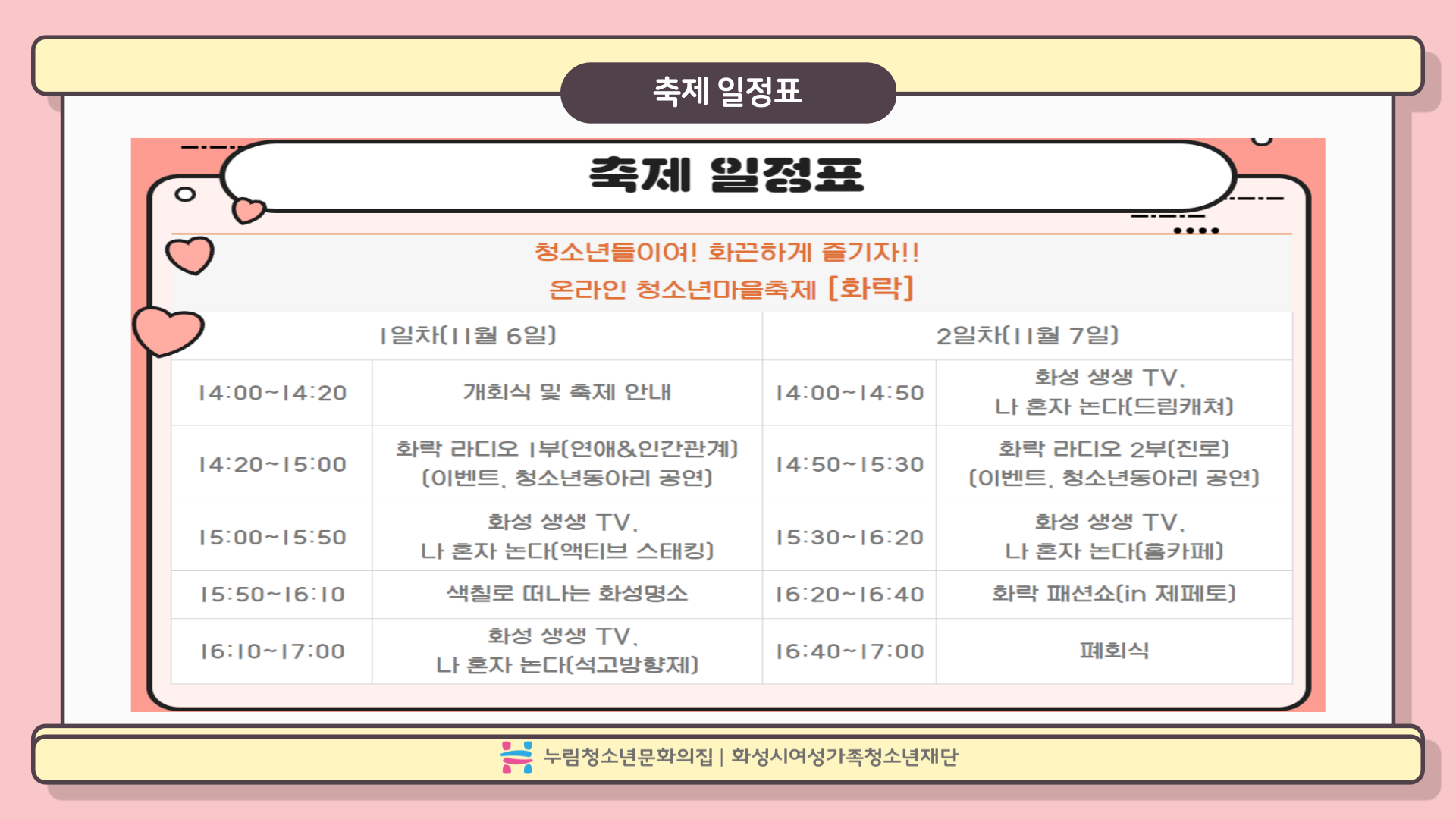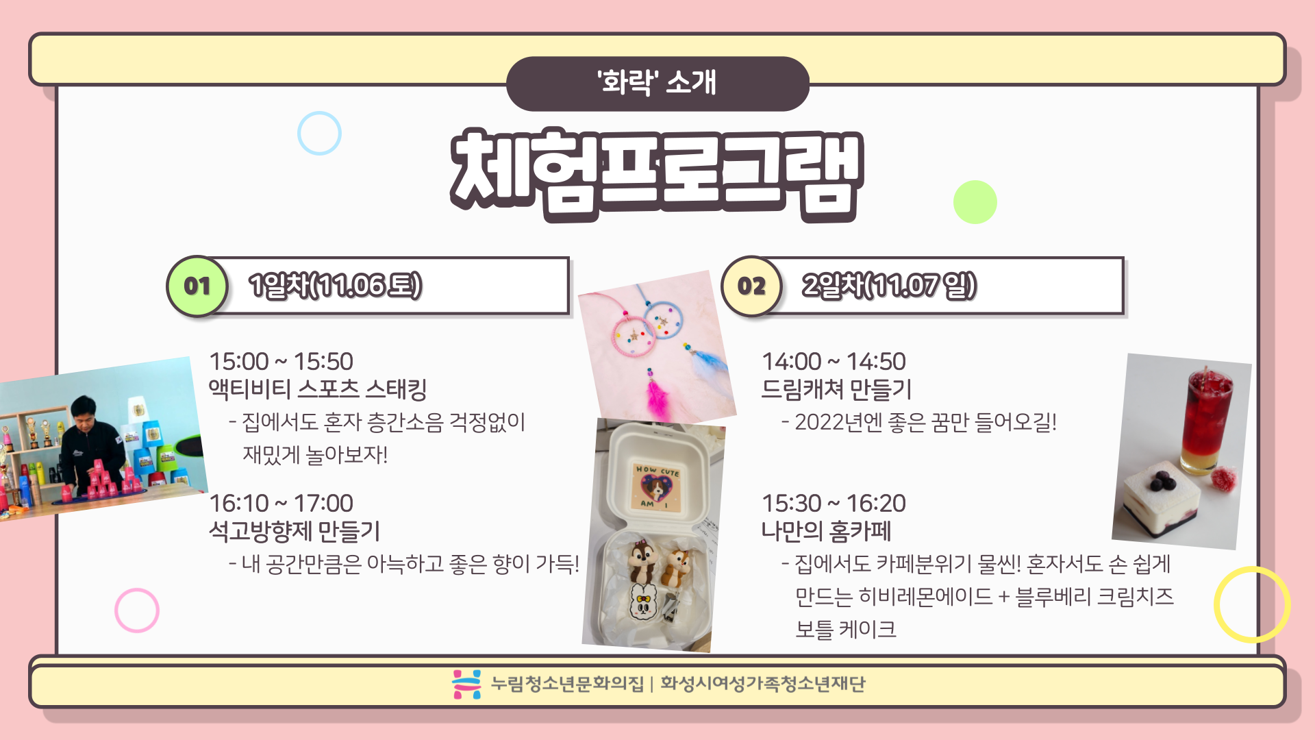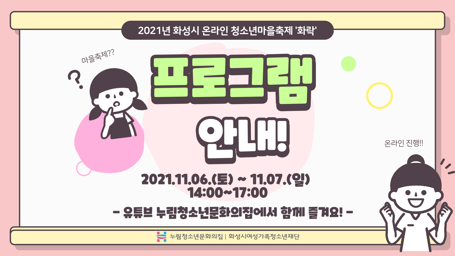 | 제목 | [누림청소년문화의집] 2021년 화성시 온라인 청소년마을축제 '화락' 프로그램 안내 | ||