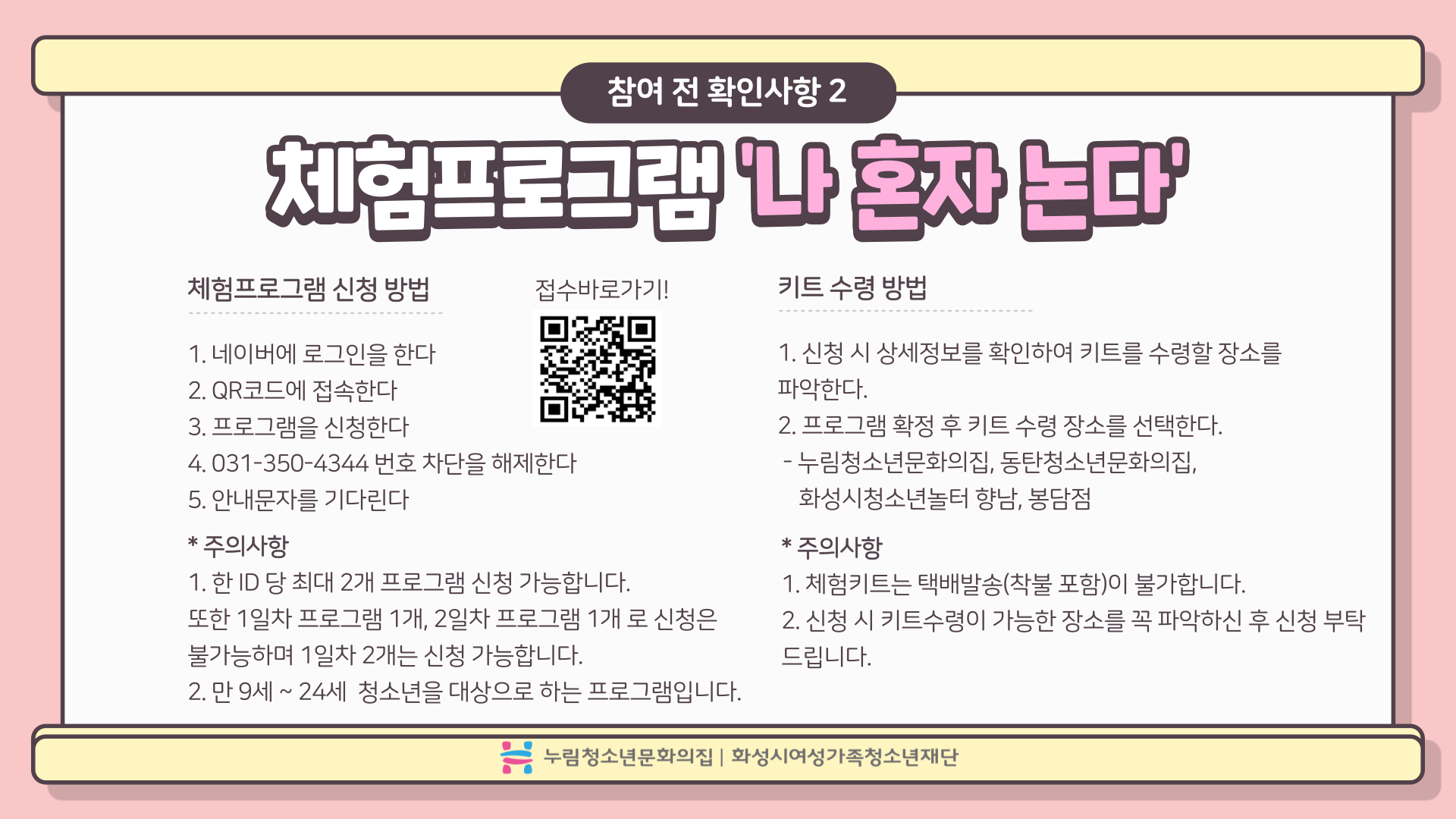 3. '나 혼자 논다' 체험프로그램 접수일정 - 접수기간: 10월 20일(수) 오전 10시 ~ 10월 27일(수) - 참가비: 무료 - 예약방법: 네이버 예약(하단의 링크 복사 또는 클릭!) https://booking.naver.com/booking/12/bizes/591168