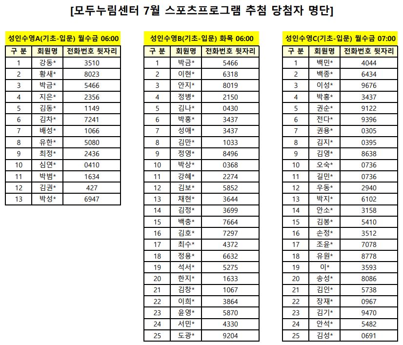 | 제목 | [모두누림센터] 7월 스포츠프로그램 추첨 당첨자 명단 | ||