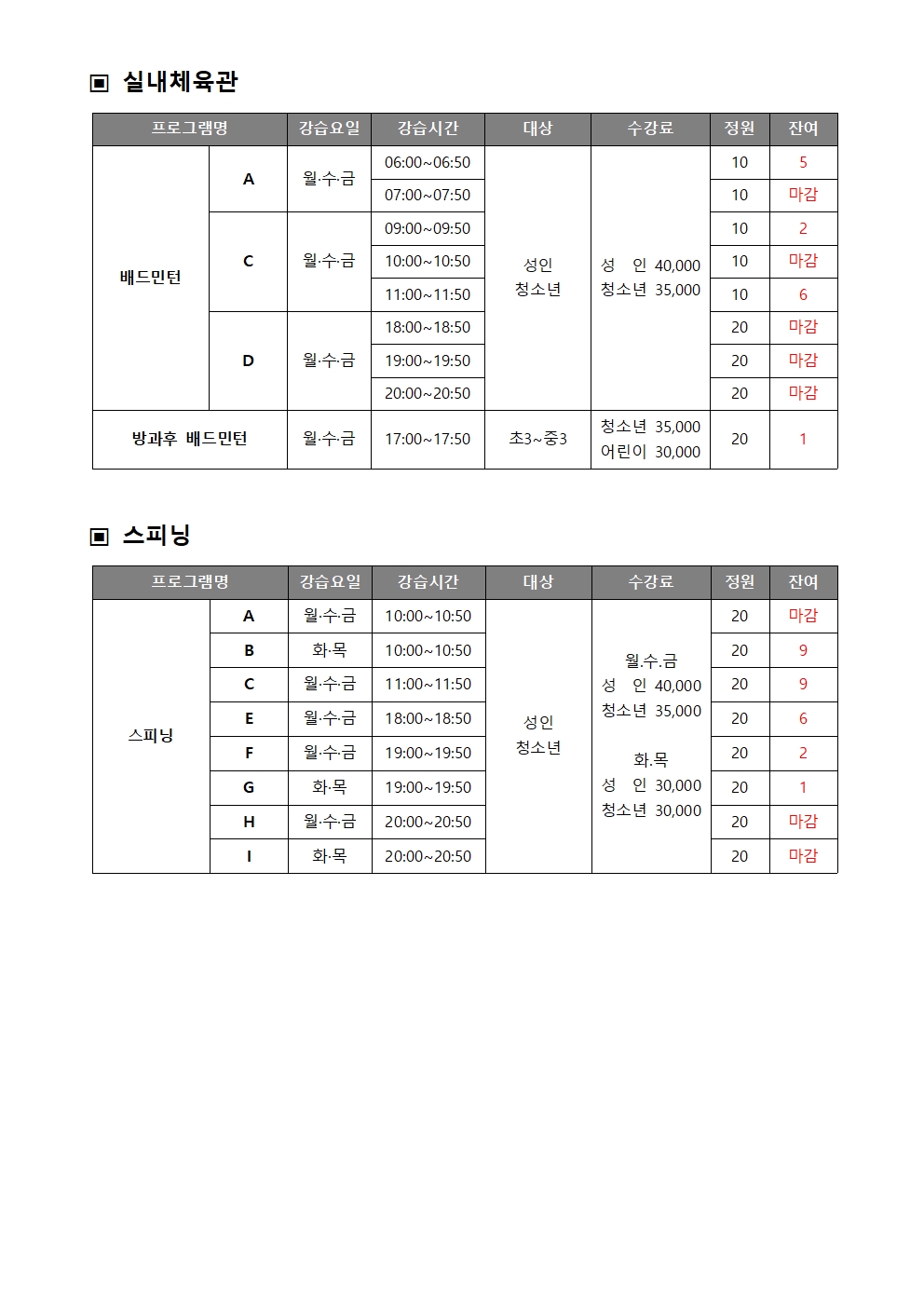 제목 [모두누림센터] 10월 스포츠프로그램 잔여자리 공지(22.09.24. 14:00기준)