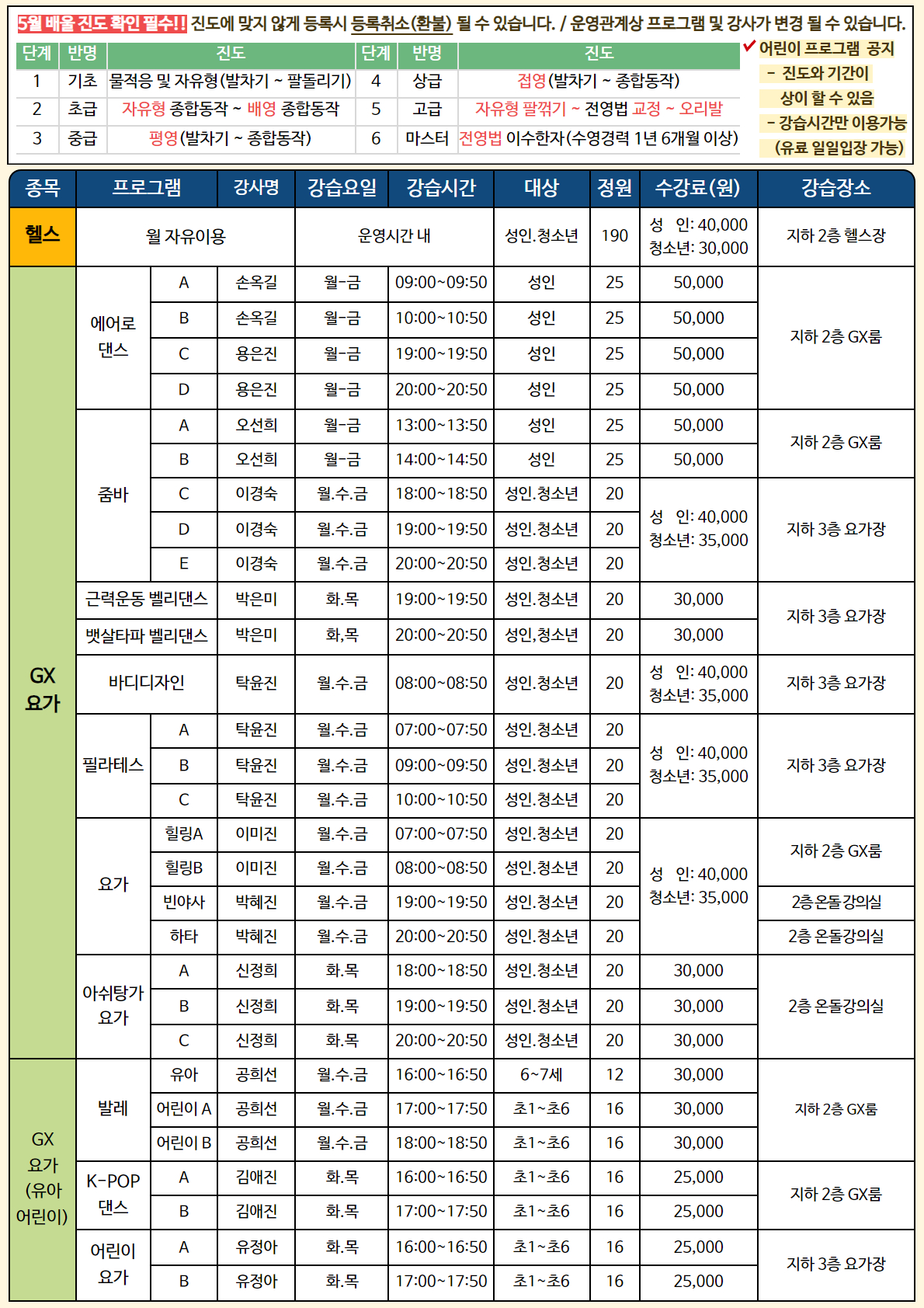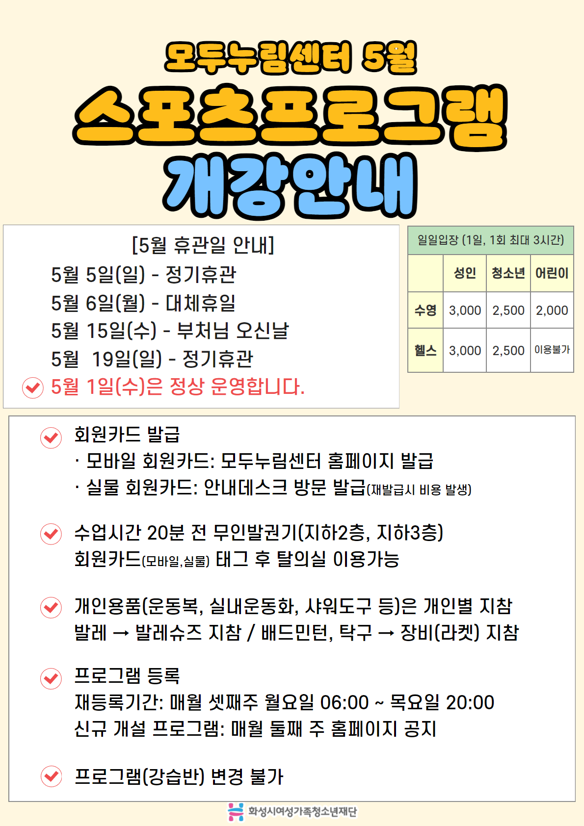1. 강습기간: 2024. 5. 1.(수) ~ 5. 31.(금) 2. 휴관일 - 5월 5일(일) : 정기휴관 - 5월 6일(월) : 대체공휴일 - 5월 15일(수) : 부처님오신날 - 5월 19일(일) : 정기휴관 ※ 5월 1일 근로자의 날은 정상 운영합니다. 3. 회원카드 발급 가. 모바일 회원카드: 모두누림센터 홈페이지 발급 나. 실물 회원카드: 첫 수업 당일 안내데스크 방문 발급 (재발급 시 비용발생) 다. 수업시간 20분 전 무인발권기(지하2층, 지하3층) 회원카드(모바일, 실물) 태그 후 탈의실 이용가능 라. 개인용품(운동복, 실내운동화, 샤워도구 등)은 개인별 지참 - 발레 → 발레슈즈 지참 / 배드민턴, 탁구 → 장비(라켓) 지참 4. 기타사항 - 프로그램(강습반) 변경 불가 모두누림센터의 모든 강좌는 해당 월 등록하신 강좌 및 시간에만 수강이 가능하며, 임의대로 반을 변경하여 수강하거나 강사님께 반 변경을 요청하는 것은 불가하오니 유의해주시기 바랍니다. 5. 문의사항 : ☎ 031-350-4371~2 (모두누림센터 안내데스크)