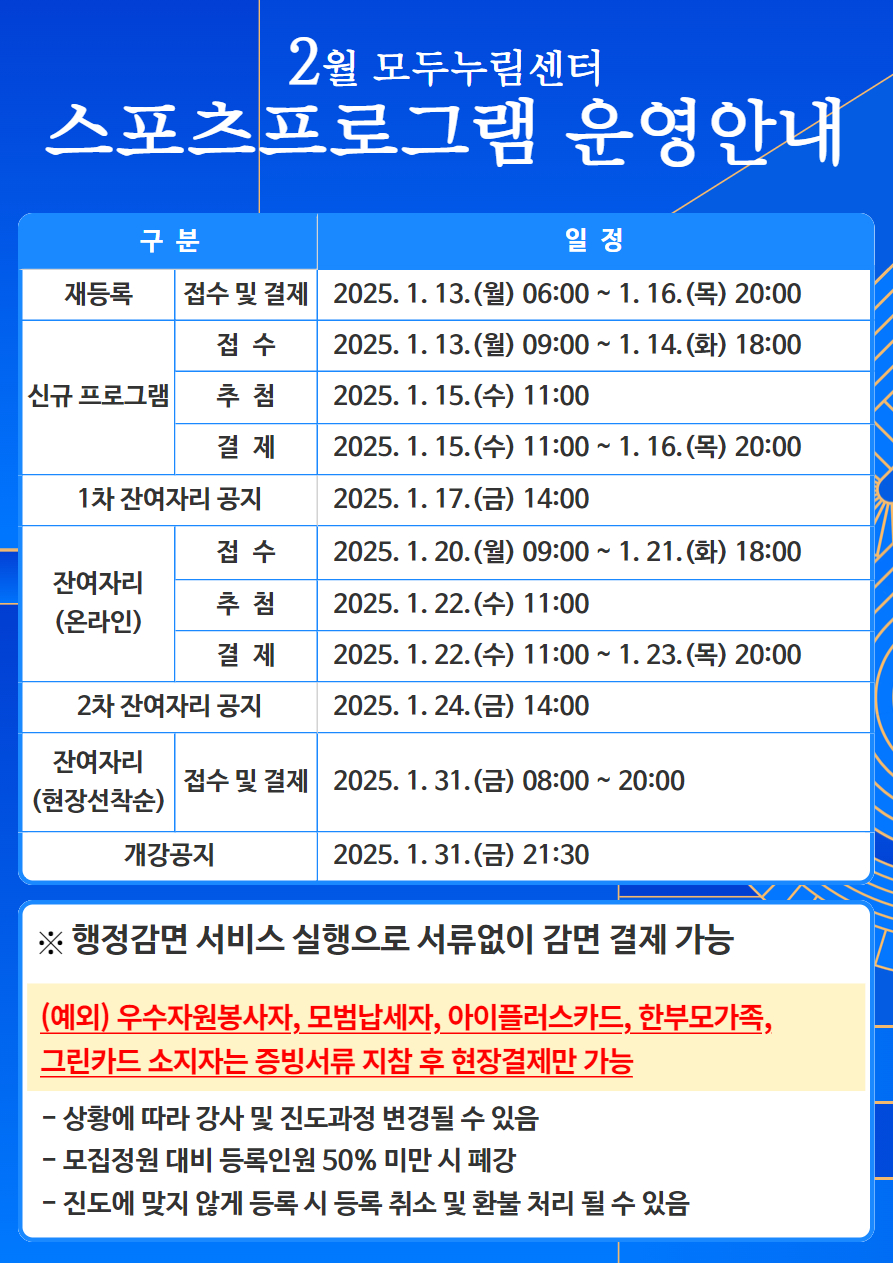 | 제목 | [모두누림센터] 2025년 2월 스포츠프로그램 운영 안내 | ||