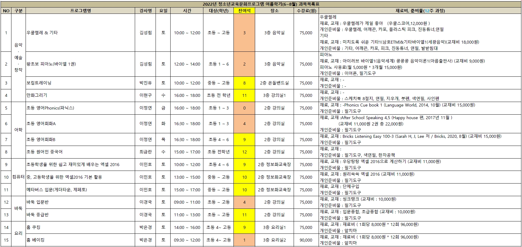 | 제목 | 누림청소년문화의집 청소년교육문화 프로그램 여름학기 (6월~8월) (12주) 수강생 모집(잔여석공지06.02. 오전11시기준) | ||