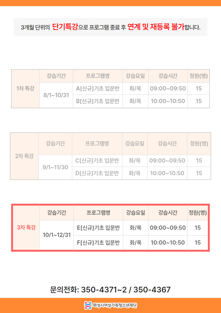 3개월 단위의 소그룹 단기특강으로 프로그램 종료 후 연계되는 반이나 재등록은 불가합니다. 특강 종료 후 다른 프로그램 등록 시 신규접수기간에만 등록 가능합니다. 이용에 착오없으시기 바랍니다. |