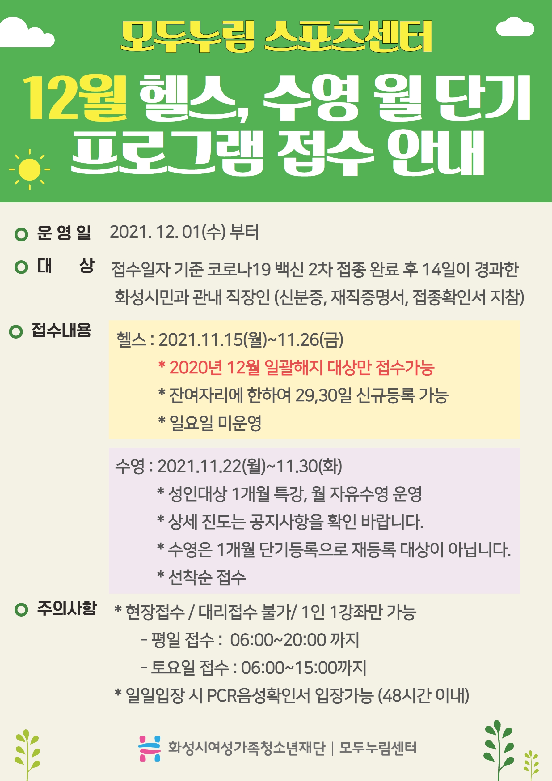12월 스포츠센터 헬스, 수영(1개월 단기) 접수 안내