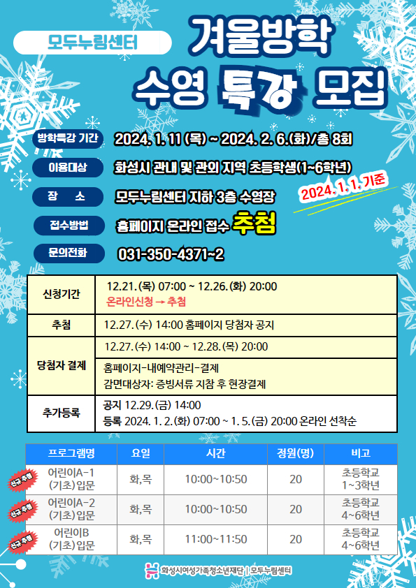 방학특강 기간: 2024. 1. 11.(목) ~ 2024. 2. 6.(화)/총 8회 이용대상: 화성시 관내 및 관외 지역 초등학생(1~6학년) 장 소: 모두누림센터 지하 3층 수영장 접수방법: 홈페이지 온라인 접수 추첨 문의전화: 031-350-4371~2