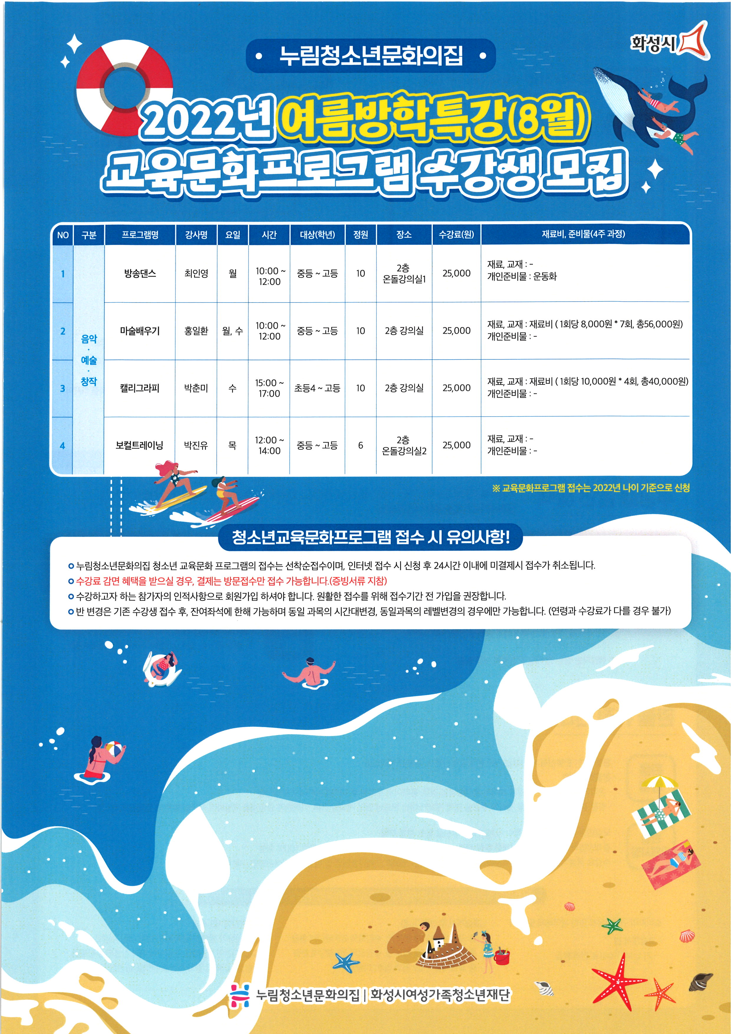 | 제목 | [누림청소년문화의집] 청소년 교육문화프로그램 여름방학특강(8월/4주) 수강생 모집 | ||