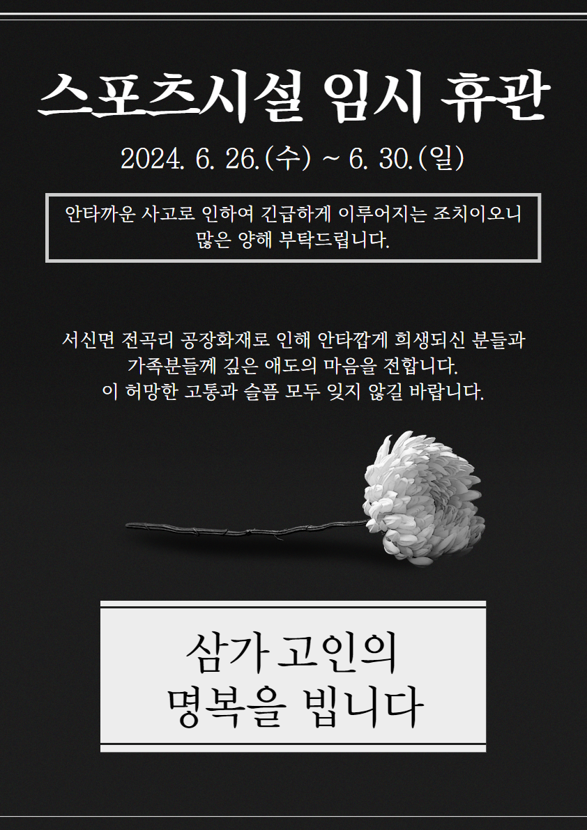 모두누림센터 스포츠 회원님들께 안내말씀드립니다. 서신면 전곡리 공장화재 임시 대책본부로 모두누림센터를 사용하게 되었습니다. 이에 따라 6. 26.(수)~6. 30.(일) 까지 스포츠시설 임시 휴관을 알려드립니다. 안타까운 사고로 인하여 긴급하게 이루어지는 조치이오니 회원님들의 많은 양해 부탁드립니다. |