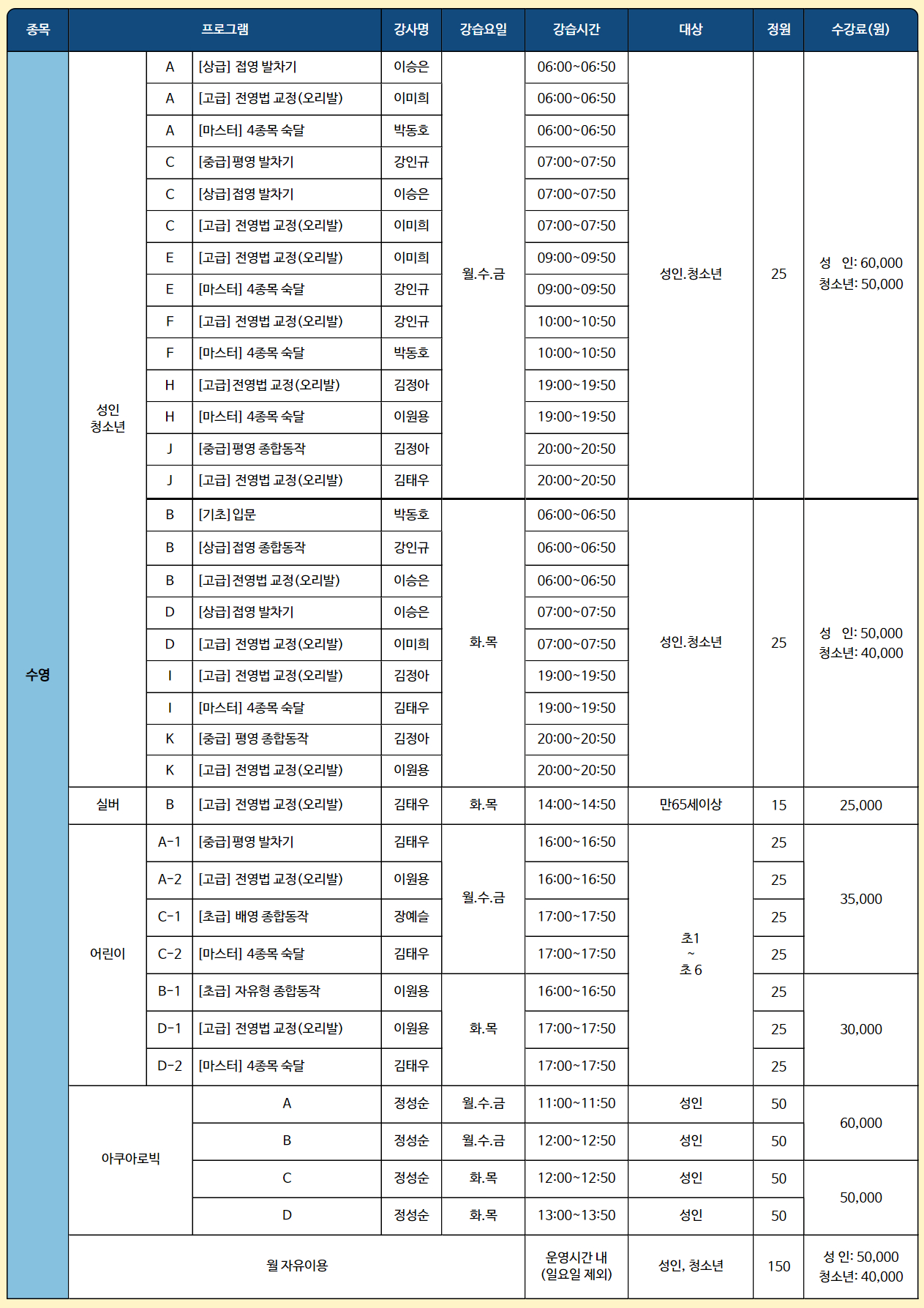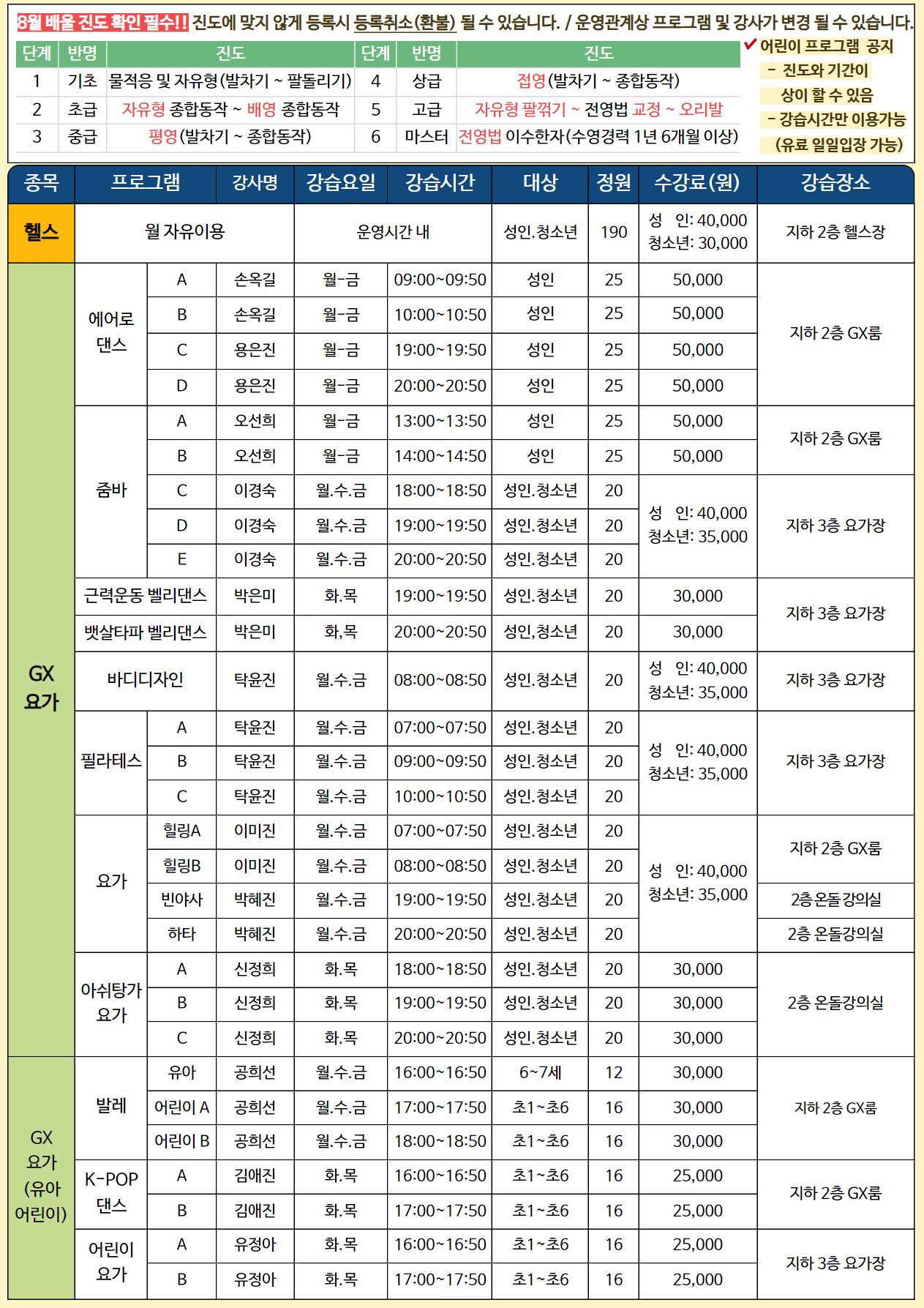 1. 강습기간: 2024. 8. 1.(목) ~ 8. 31.(토) 2. 휴관일 - 8월 4일(일) : 휴관 - 8월 15일(목) : 광복절 - 8월 18일(일) : 휴관