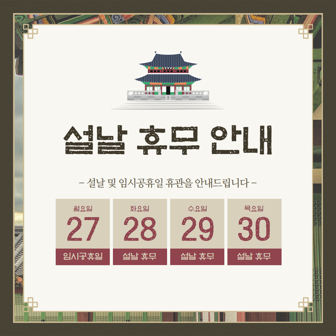 제목 [모두누림센터] 설날 및 임시공휴일 휴관 안내 운영센터 모두누림센터 작성일 2025년 1월 8일 14시 53분 조회수 865 첨부 파일 아이콘제목을 입력하세요.jpg (662KB)다운로드 아이콘 목록보기