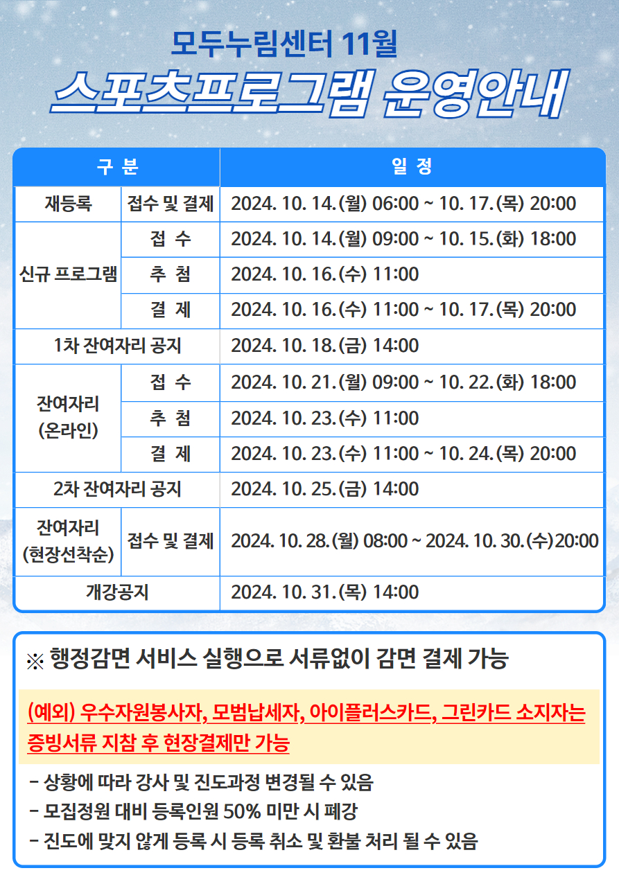 | 제목 | [모두누림센터] 11월 스포츠프로그램 등록안내 (정정) | ||