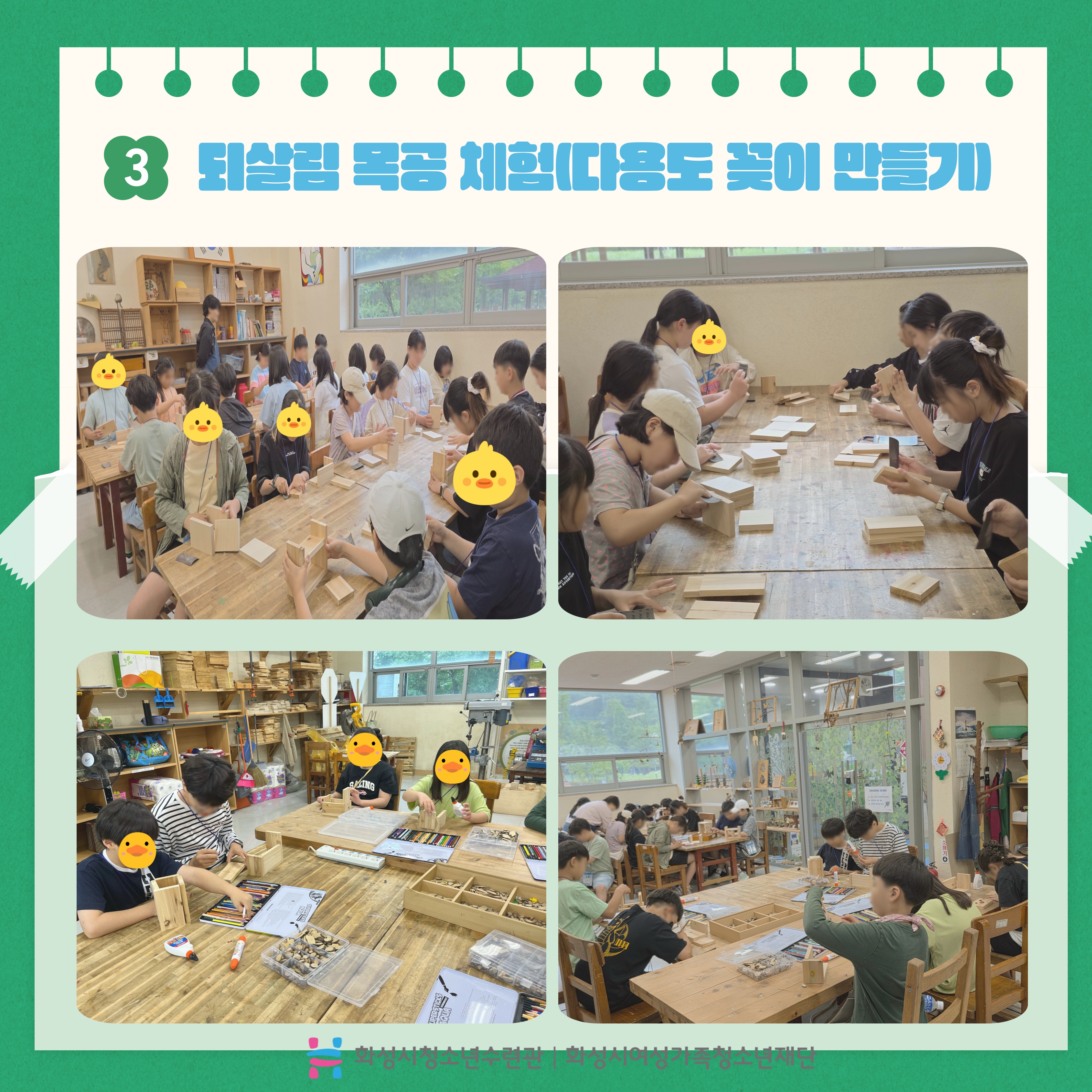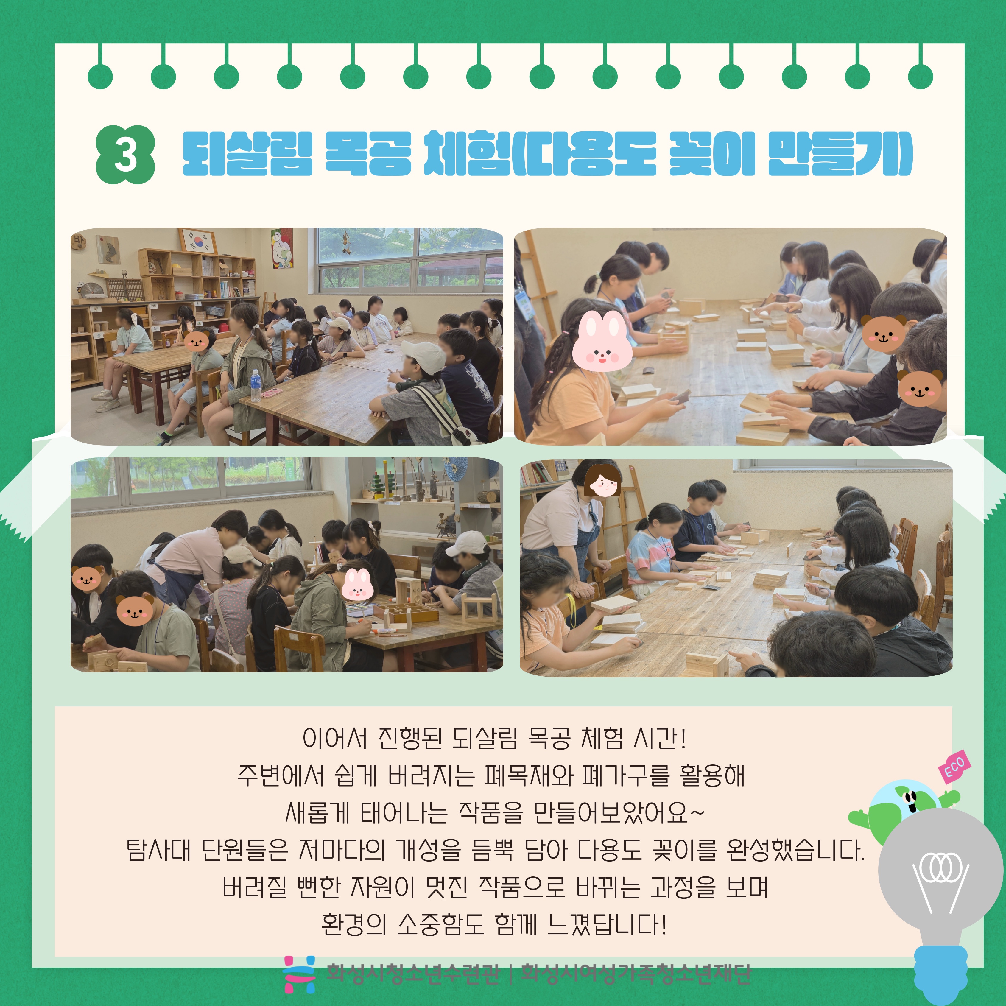 되살림 목공 체험 시간에는 버려지는 폐목재를 활용해 탐사대만의 멋진 다용도 꽂이도 만들어보았습니다. 마지막으로 진행된 에코상식 퀴즈대회에서는 오늘 배운 내용을 떠올리며 문제를 풀고, 제로웨이스트 키트도 선물로 받았어요. 모두가 적극적으로 참여하며 유익하고 의미 있는 시간을 보냈습니다. 앞으로도 다양한 탐사대 활동이 계속될 예정이니 많은 관심과 응원 부탁드립니다! |