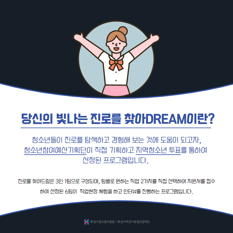 당신의 빛나는 진로를 찾아드림은 청소년참여예산 기획단이 직접 기획하고 청소년 투표를 통하여 선정된 프로그램입니다.