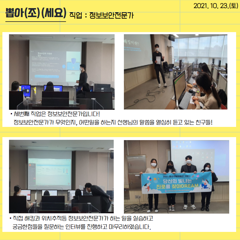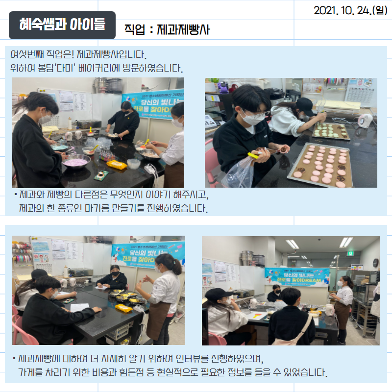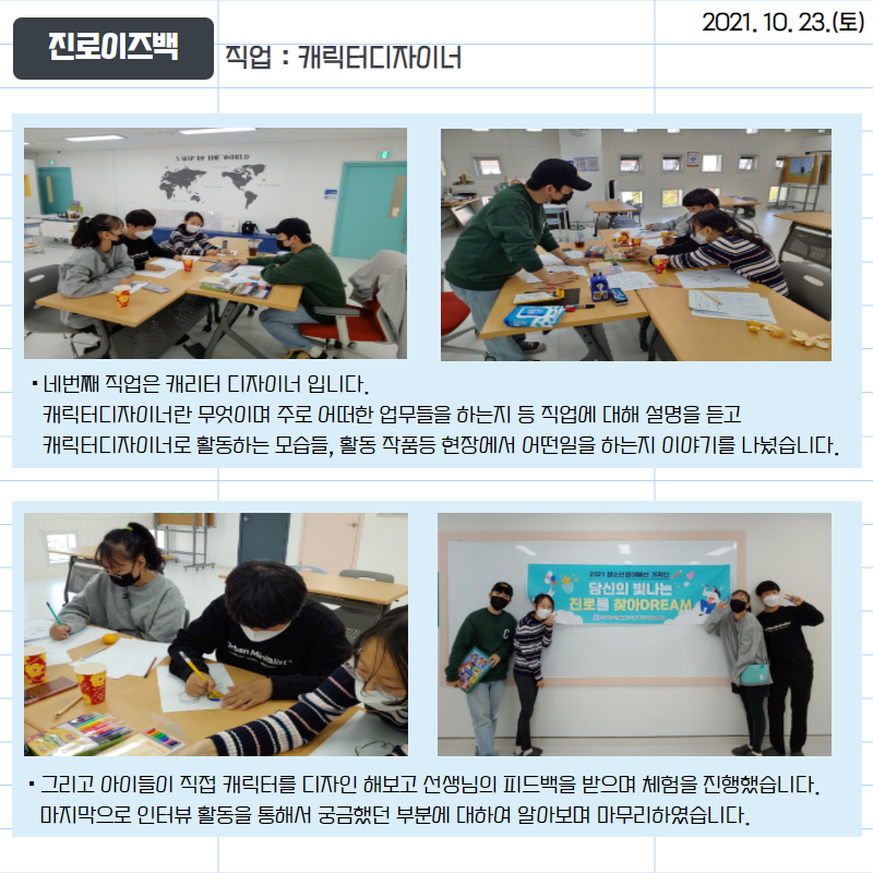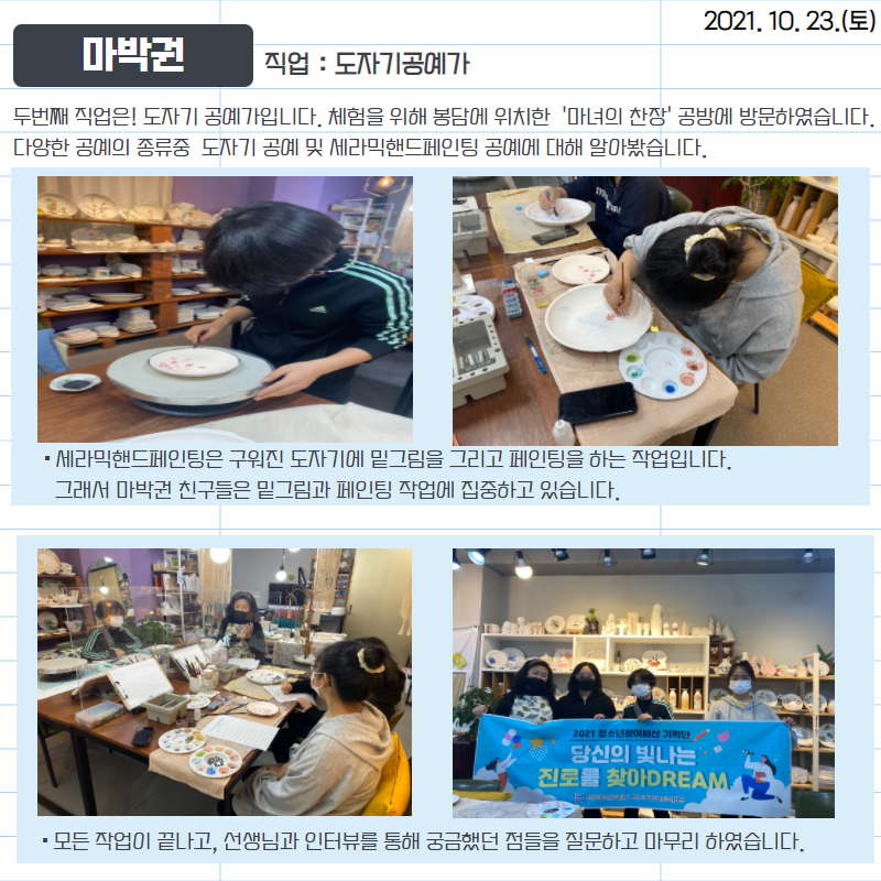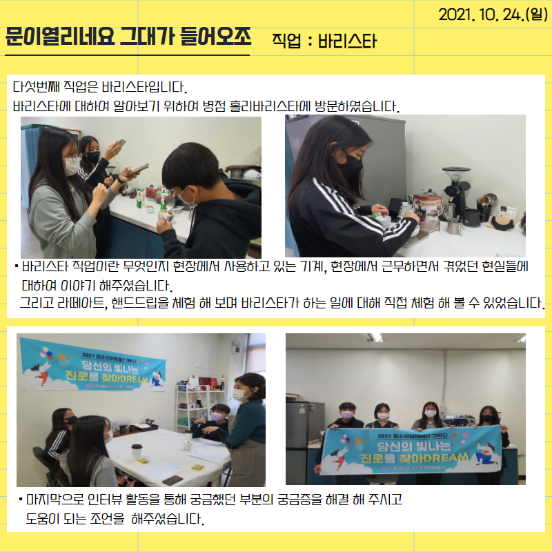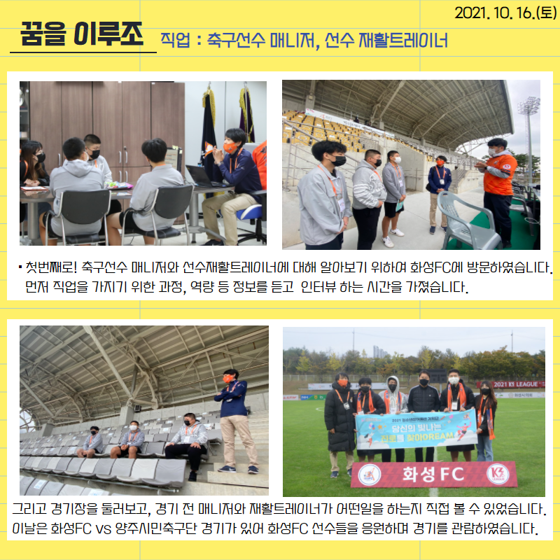 청소년들의 진로 탐색과 다양한 현장체험 경험을 위하여 진행되었으며 1차에는 '축구선수 매니저', '선수재활트레이너', '캐릭터디자이너', '공예가', '정보보안전문가' '바리스타', '제과제빵사'에 대하여 알아보았습니다.