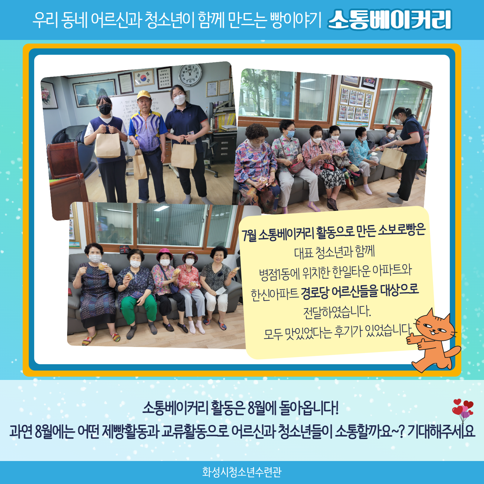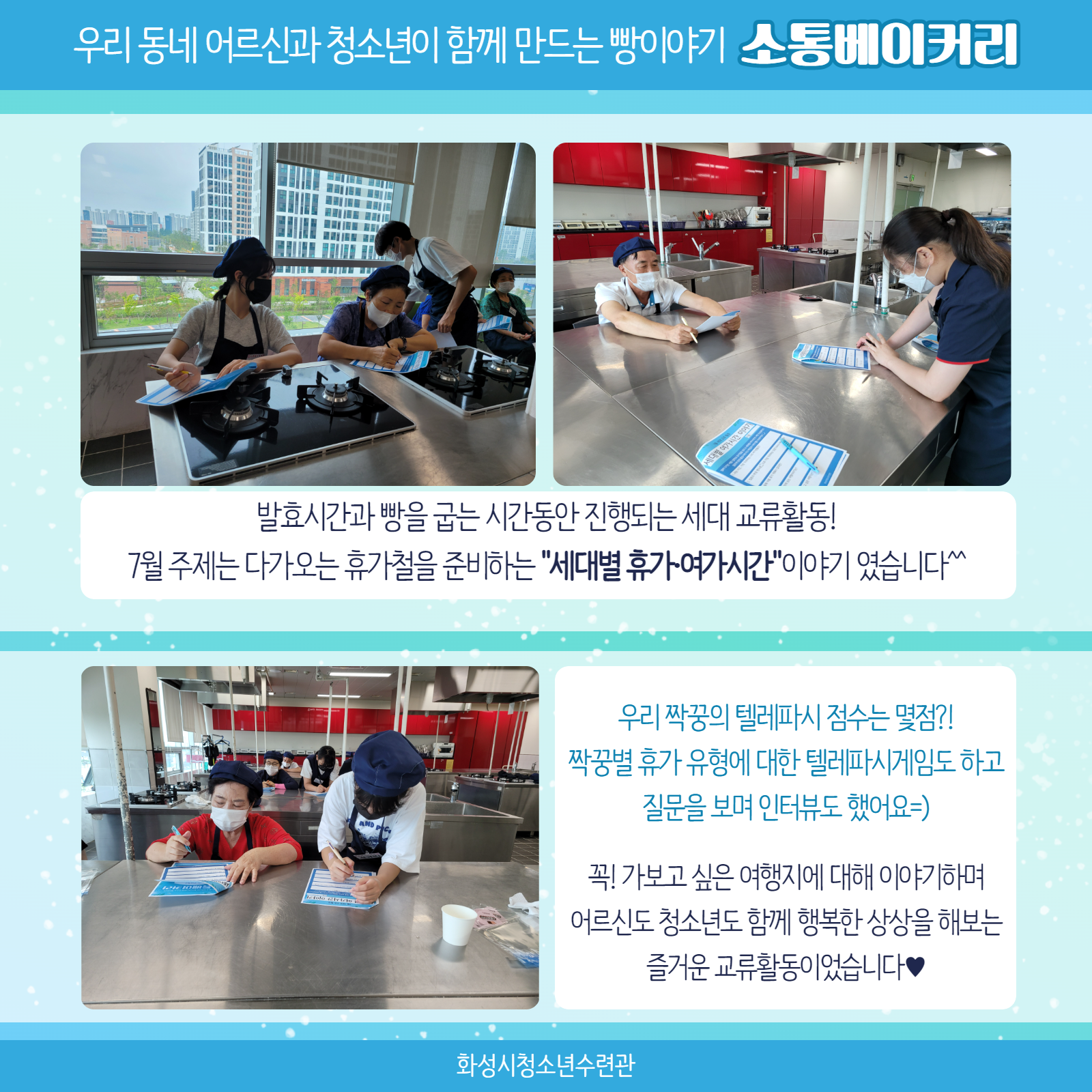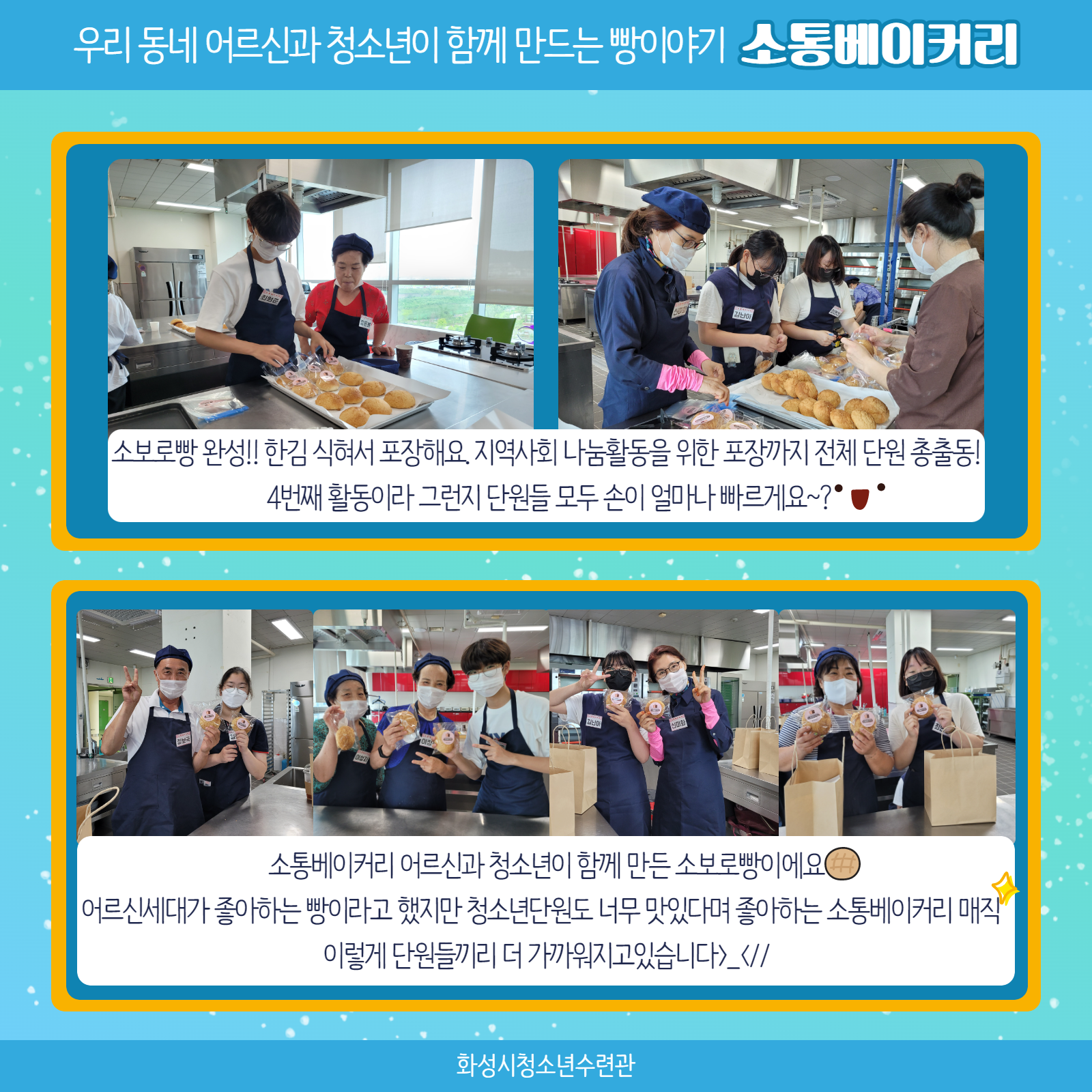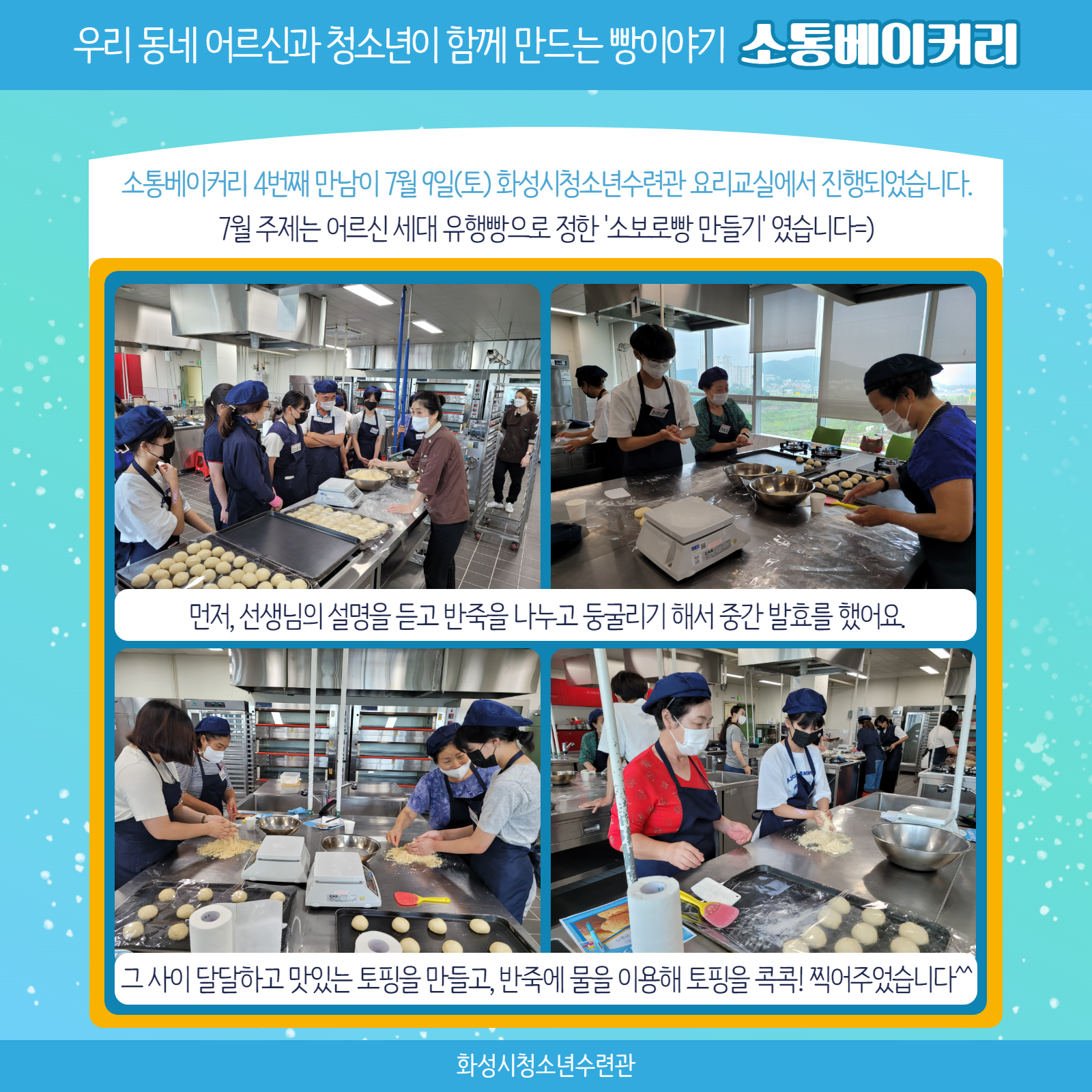 [화성시청소년수련관] 7월 소통베이커리 정기활동 '소보로빵 만들기' 재단에 바랍니다 상세 운영센터 유앤아이센터 등록일 2022년 7월 11일 16시 19분 조회수 696 #소통베이커리 #화성시청소년수련관#어르신_청소년#세대교류활동7월 9일(토), 벌써 한달이 지나 소통베이커리 정기활동이 진행되었습니다=)7월의 빵은 어르신 세대의 유행빵 ♡소보로빵♡이었는데요!빵도 만들고 세대 교류활동도 하며 뜻깊은 시간을 보냈다고 합니다.자세한 내용은 카드뉴스로 함께 보아요>_<#제빵활동 #제빵체험 #소보로빵 #화성빵맛집 #병점빵집 #빵순이 #빵돌이 #세대통합 #청소년 #어르신 목록보기