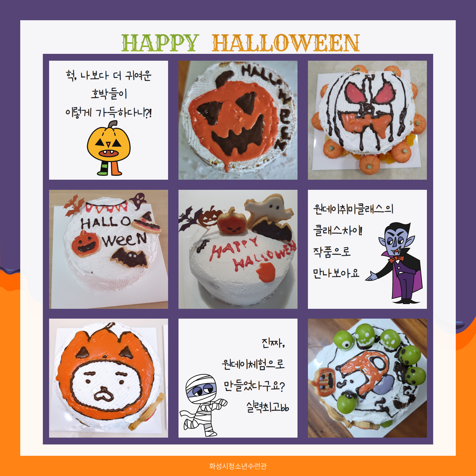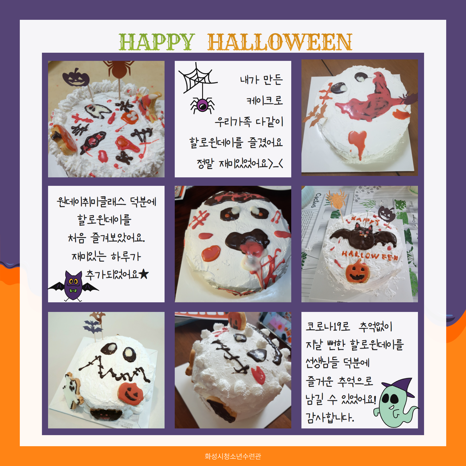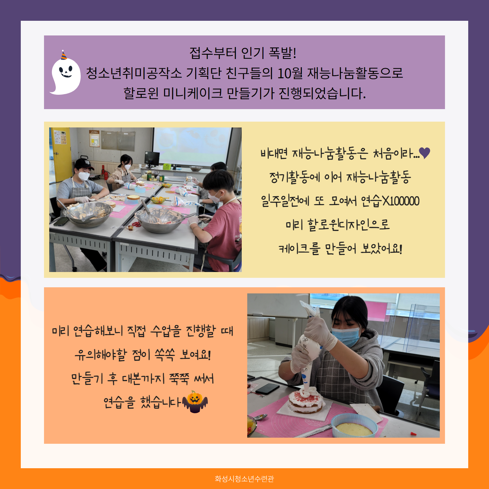 [화성시청소년수련관] 청소년취미공작소 기획단 재능나눔활동 <10월 원데이취미클래스-할로윈케이크만들기> 재단에 바랍니다 상세 운영센터 유앤아이센터 등록일 2021년 11월 3일 11시 16분 조회수 634 #화성시청소년수련관#청소년취미공작소#재능나눔활동#원데이취미클래스취미공작소 기획단 친구들의 10월 재능나눔활동 <원데이취미클래스-할로윈 미니케이크 만들기> 활동이 10월 24일~10월 31일동안 진행되었습니다^^비대면 재능나눔활동은 처음이라,, 기획단 친구들이 더더더! 열심히 준비했는데요덕분에 대 성공>_<//자세한 내용은 카드뉴스로 함께 보아요♥#할로윈체험 #할로윈케이크 #케이크만들기 #할로윈즐기기#청소년취미 #청소년체험 #비대면체험 #원데이클래스 목록보기